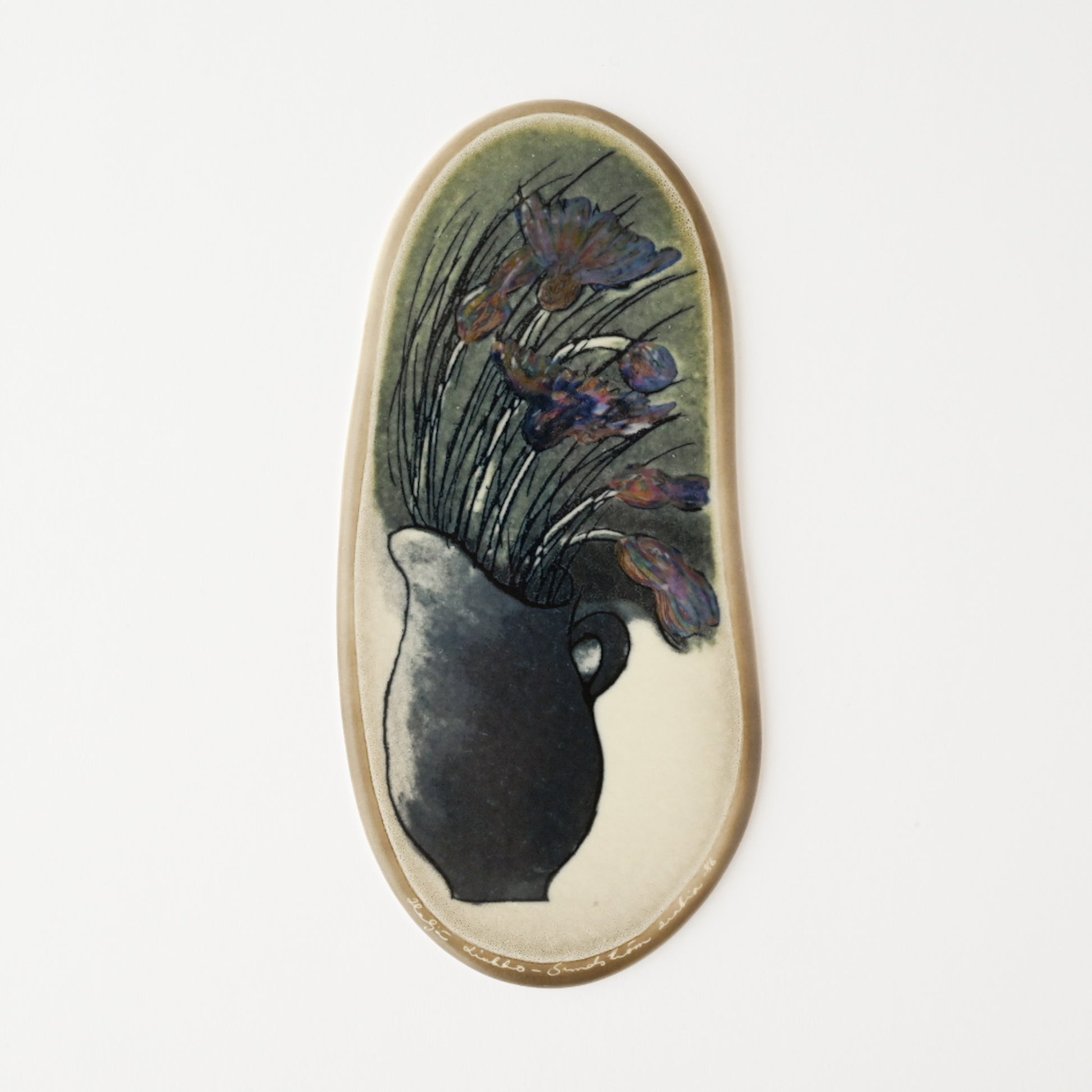 ヘルヤの作品のほとんどは植物や風景のカラフルなモチーフが穏やかな表現で描かれています。こちらの作品は矢車菊がモチーフで、まるで物語の一部が切り取られたような雰囲気。落ち着いたトーンの中にキラリと輝く花びらがとても魅力的です。ヘルヤの目にしたものが大切に包み込まれているような、素敵な贈り物をもらったようなそんな温かい気持ちになる作品を、どうぞご堪能ください。
