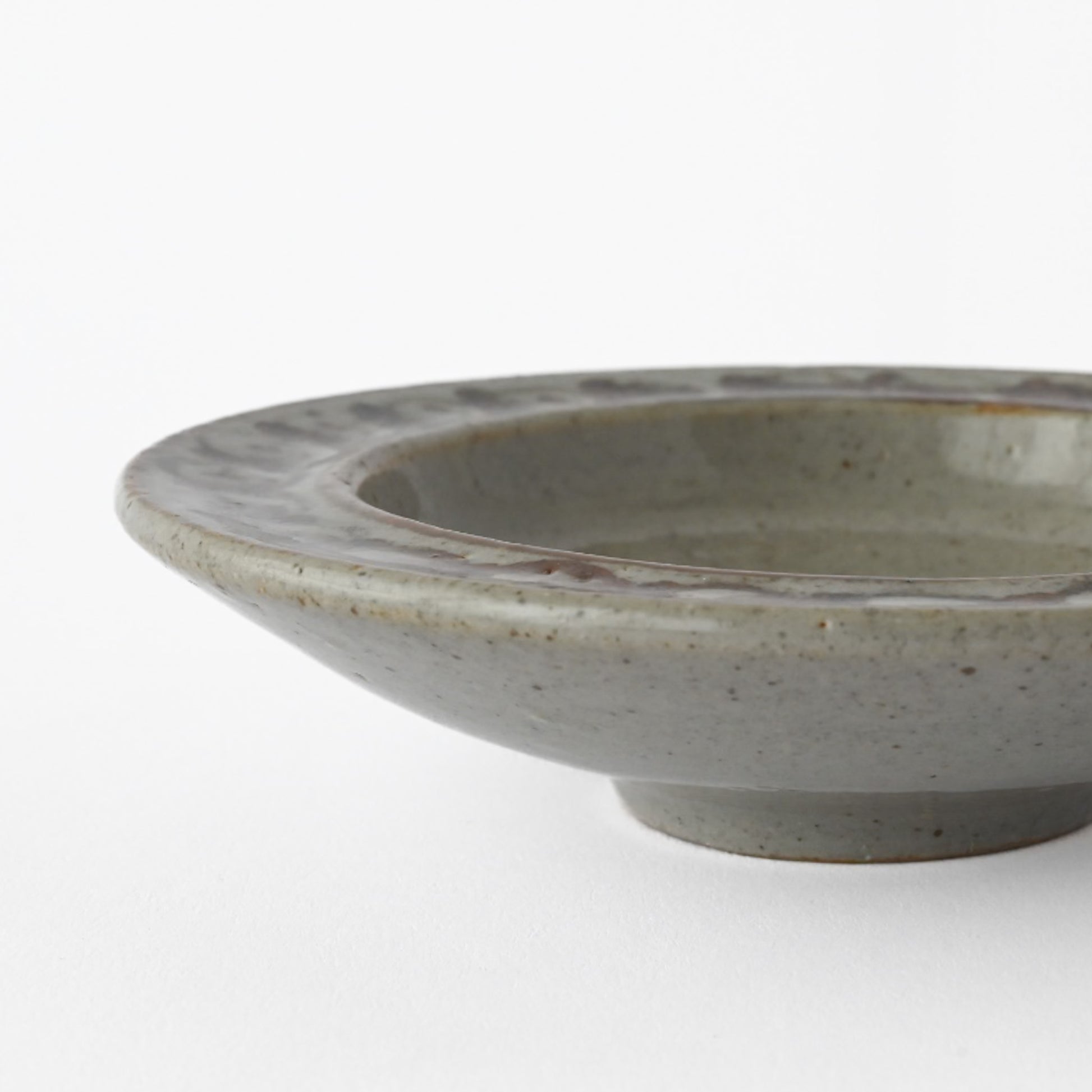 縁に並べられた模様が特徴的で、丁寧な手仕事が感じられる一枚です。落ち着いた色合いと質感は、日本の食器と並べても自然に馴染みます。取り分け皿や小菓子用としても使いやすく、おすすめの一皿です。