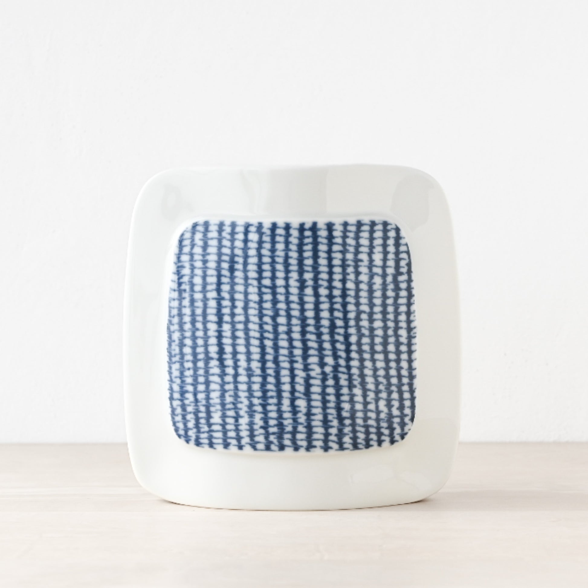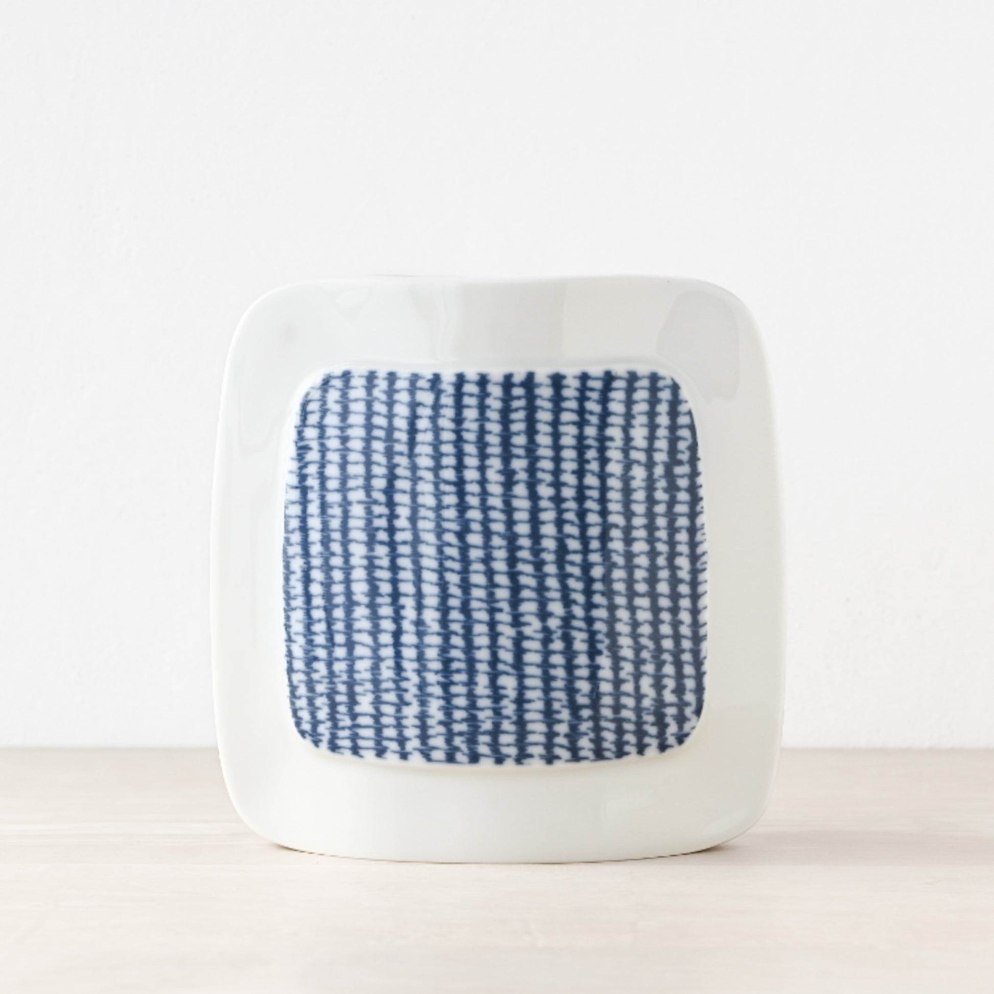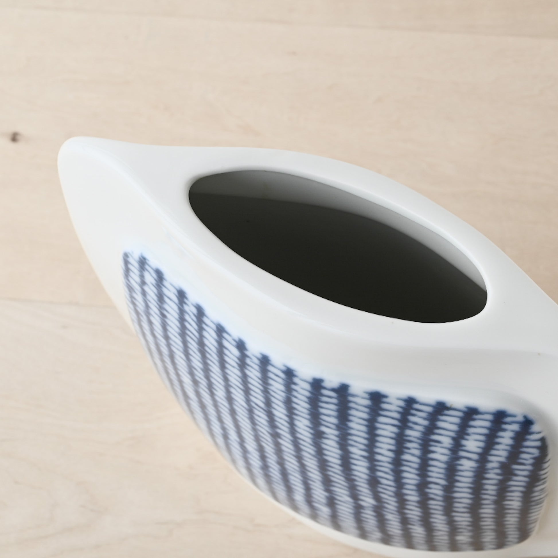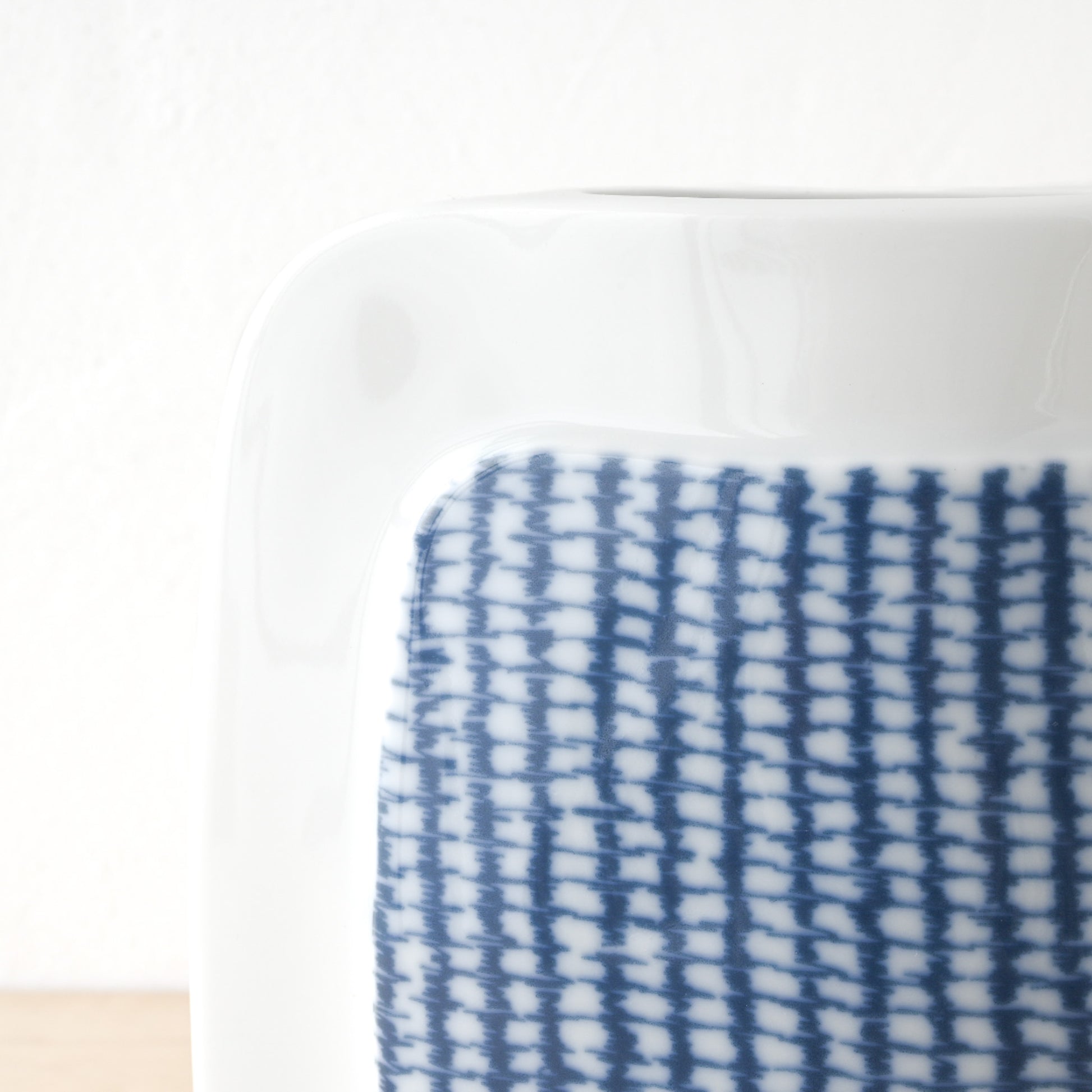 やわらかな白釉をベースに、表裏それぞれにブルーの織物のような模様が施されていて、均一すぎない表情がこの作品の魅力です。角を落としたスクエアに近いフォルムが可愛らしく、一輪挿しや枝ものとも相性がよく、空間の中でさりげなくアクセントになる一品です。