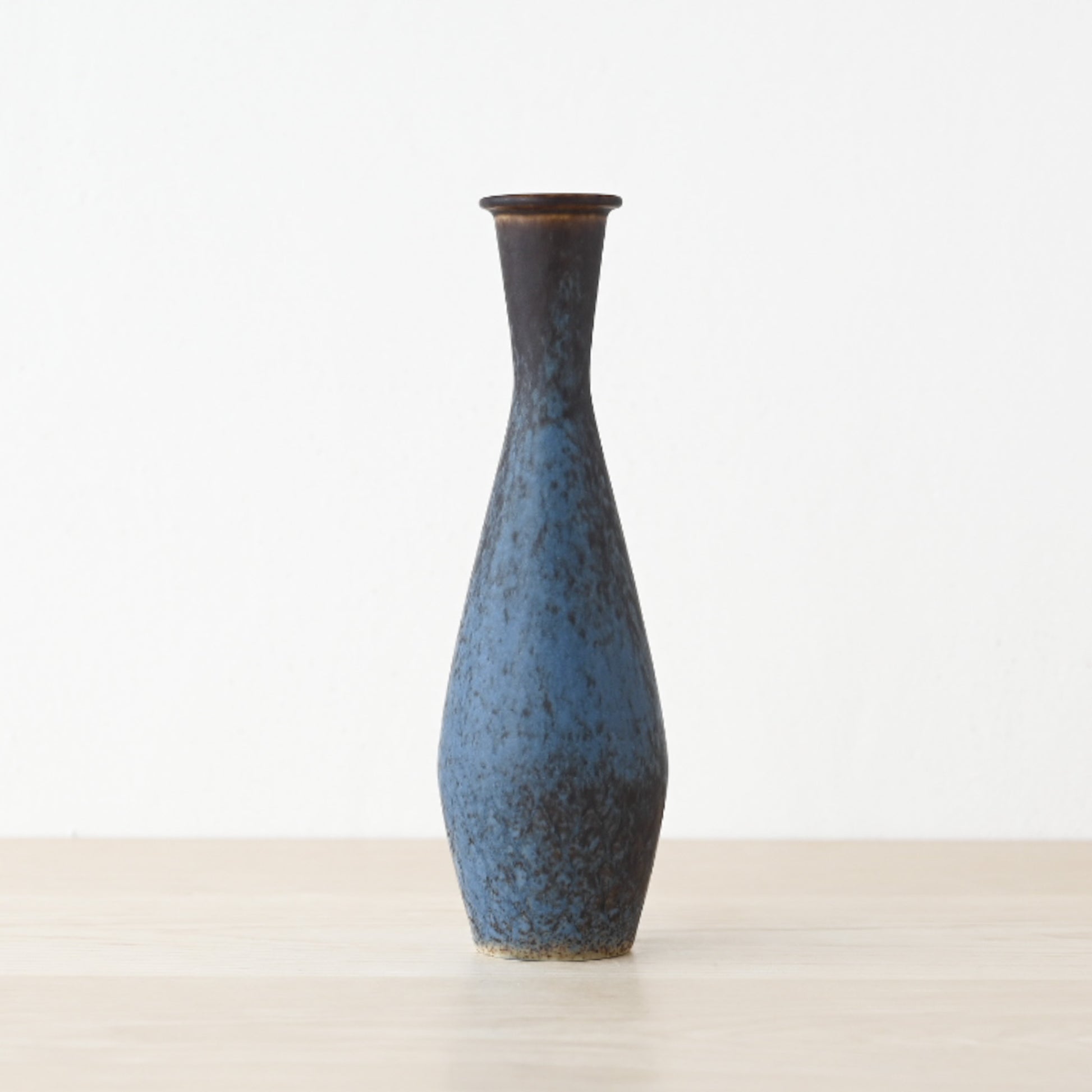 1950年代に制作され、釉薬の重なりによる複雑な色合いと、細身で気品のあるフォルムが特徴的な作品。本作では、深みのある青と濃茶色の斑模様が美しく調和し、見る角度によって異なる表情を楽しむことができます。