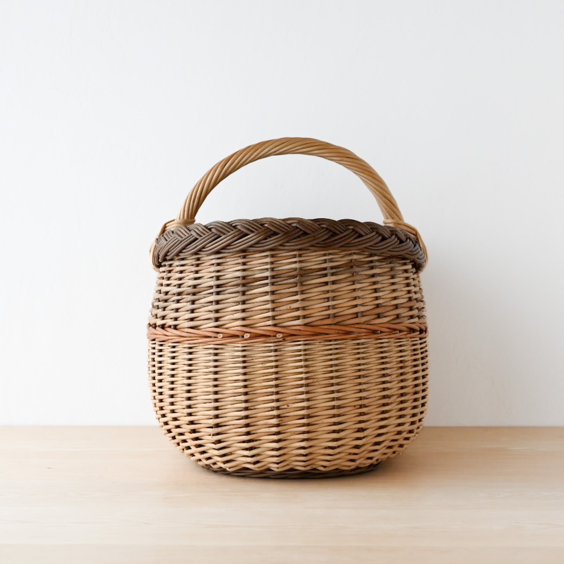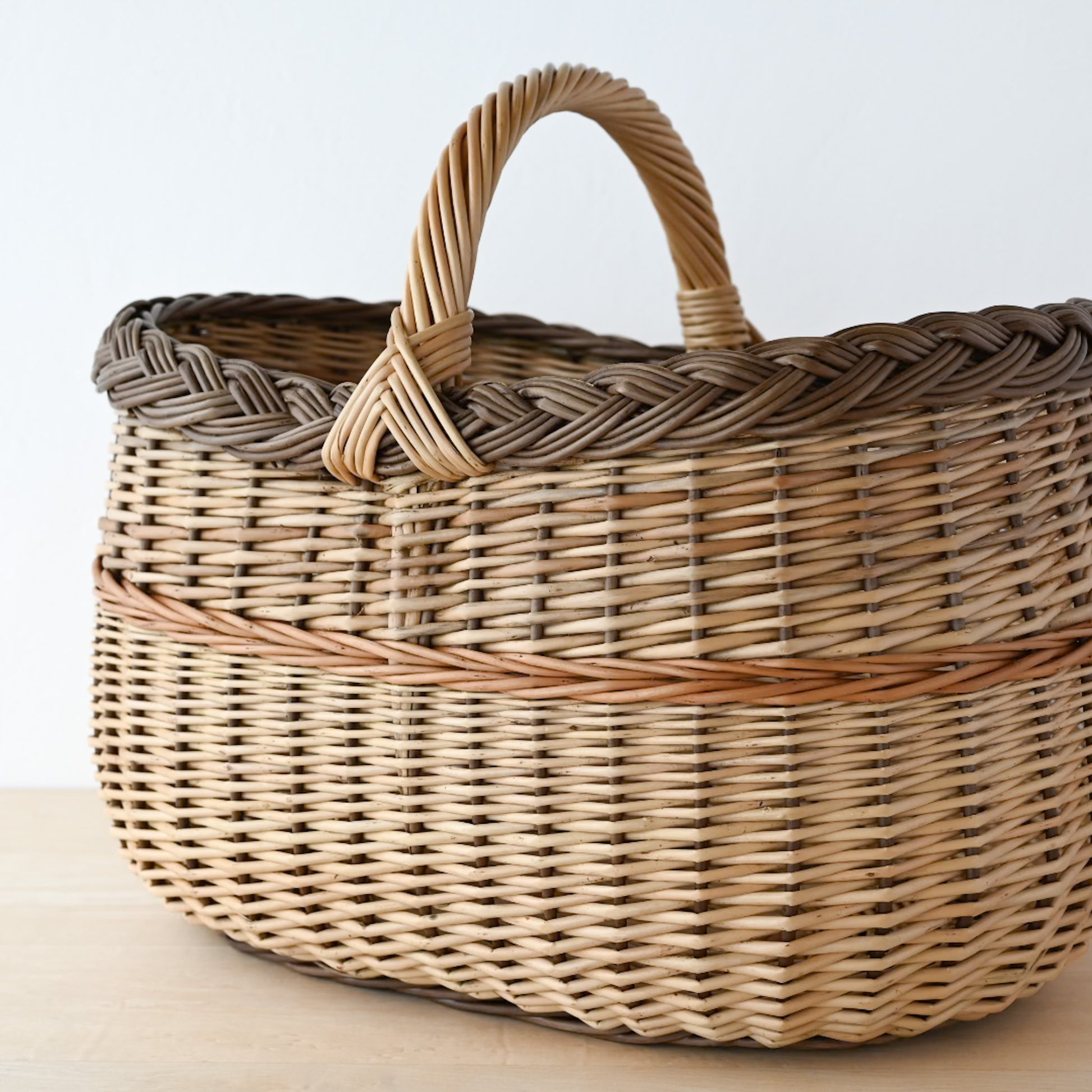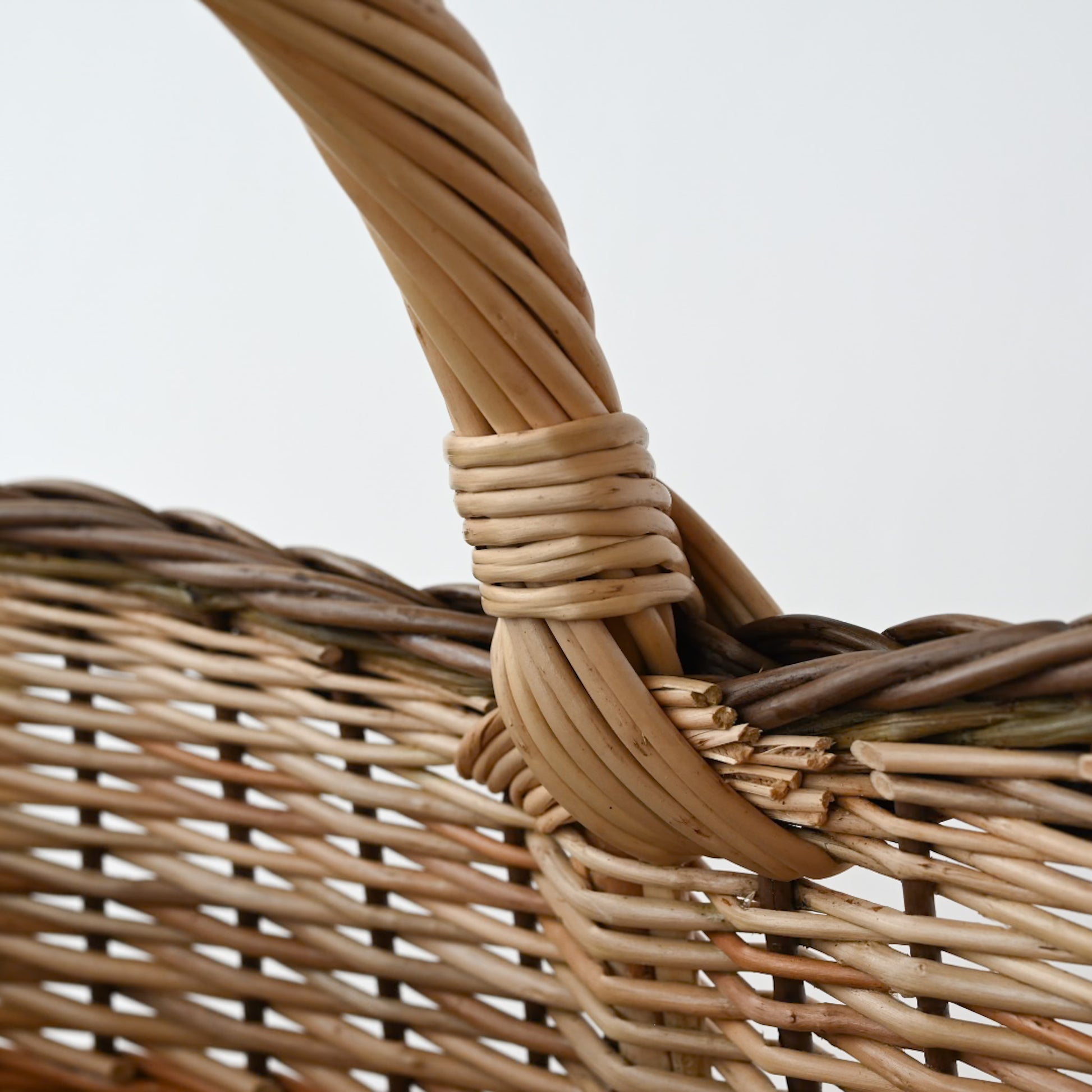 ころんと丸みを帯びた形は、ざっくりとものを入れるのにちょうどよく、ヤナギを束ねて作られた編み込みがとても可愛らしいデザインです。かごの入口は真ん中より左右が高いデザインになっていて、入れたものをすっぽりと包んでくれます。持ち手と本体がつながる部分は耐久性も兼ね備えた美しいデザイン。