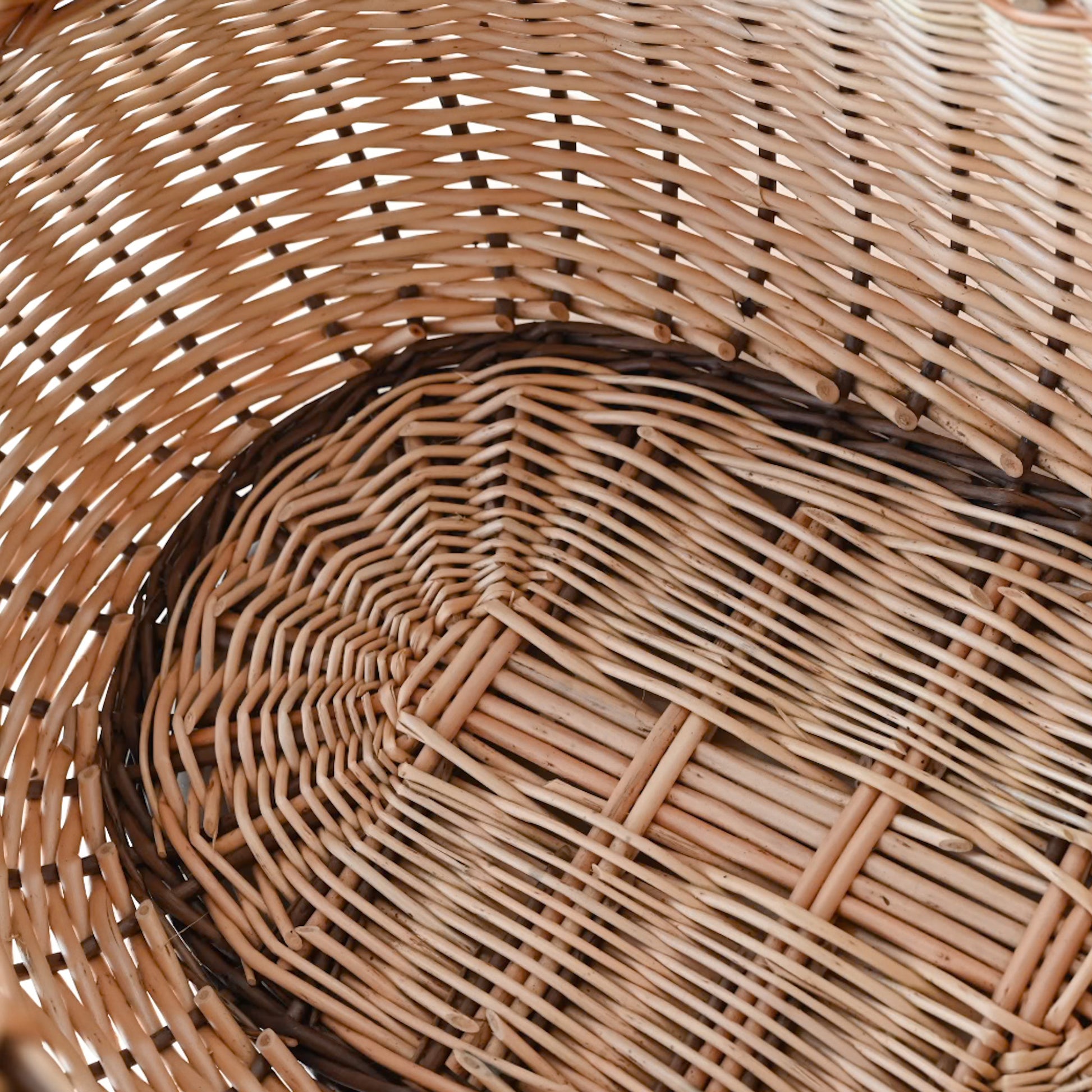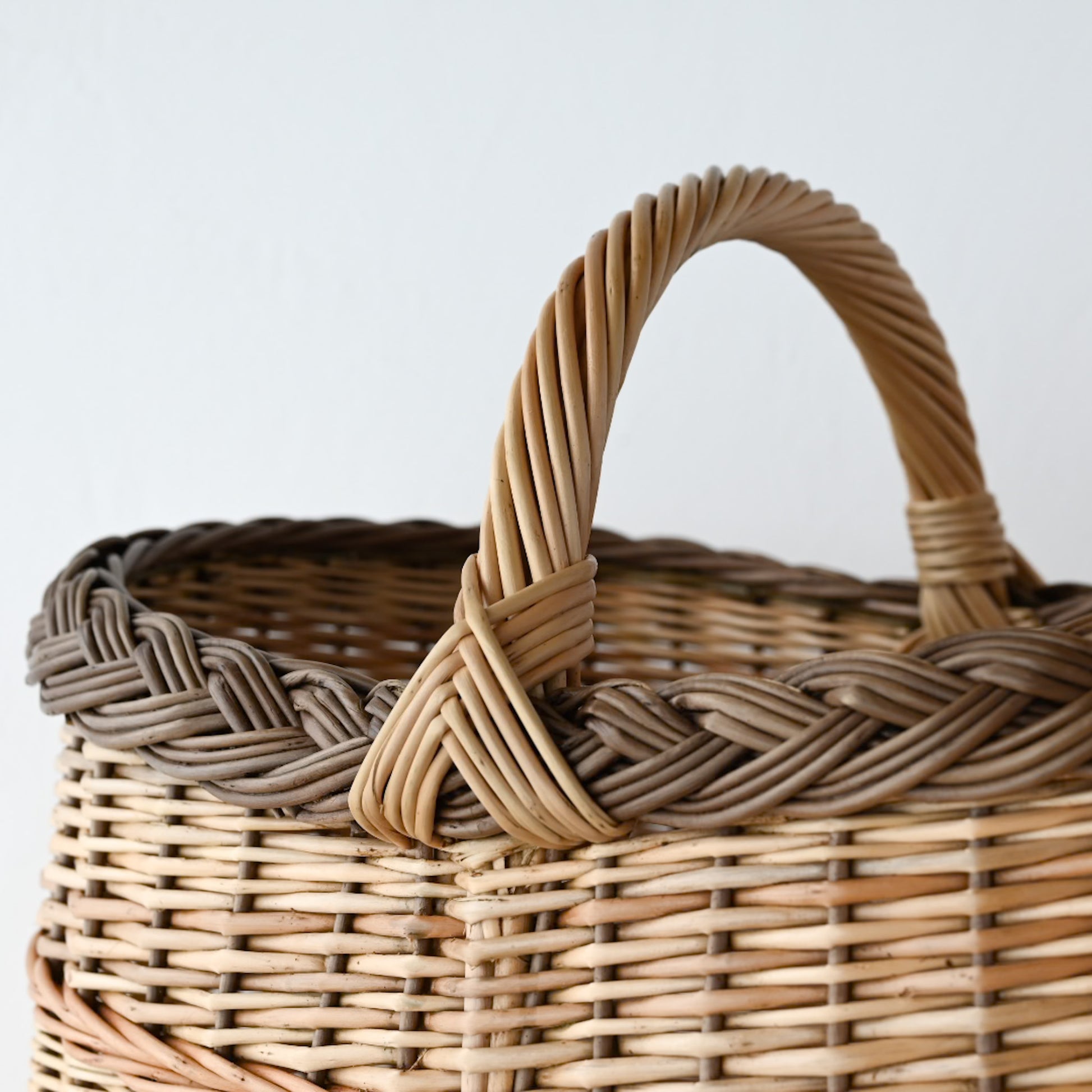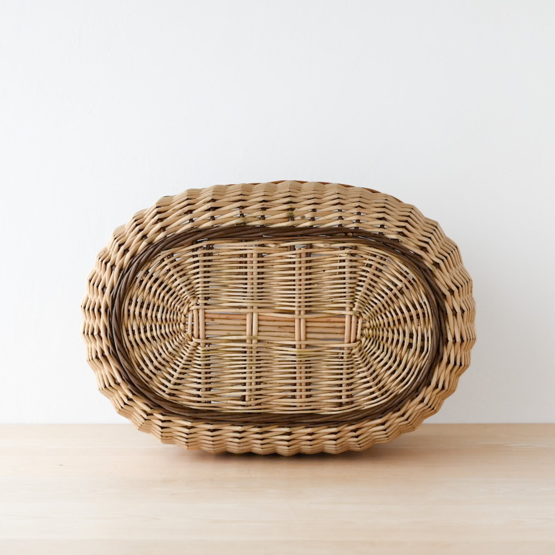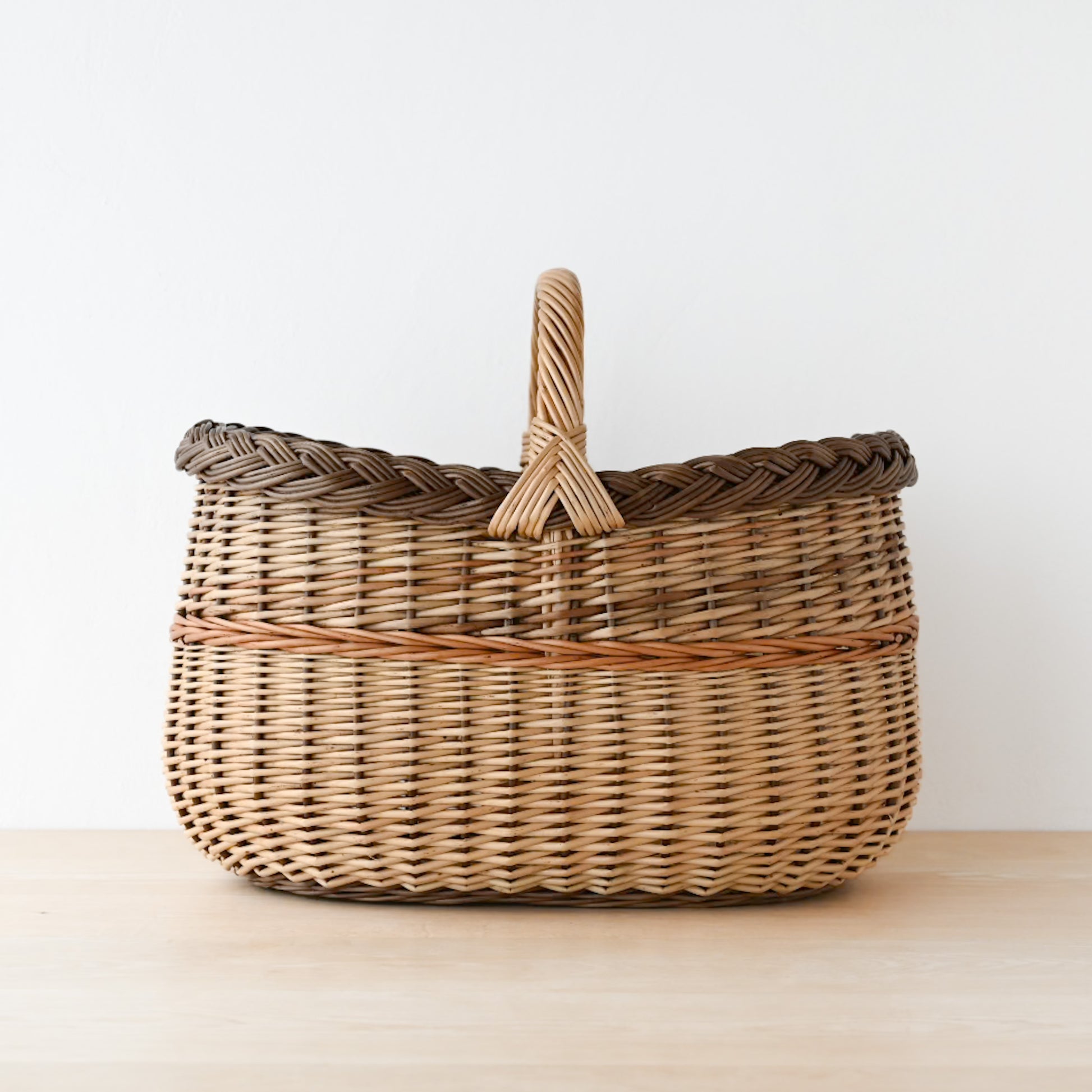 ころんと丸みを帯びた形は、ざっくりとものを入れるのにちょうどよく、ヤナギを束ねて作られた編み込みがとても可愛らしいデザインです。かごの入口は真ん中より左右が高いデザインになっていて、入れたものをすっぽりと包んでくれます。持ち手と本体がつながる部分は耐久性も兼ね備えた美しいデザイン。