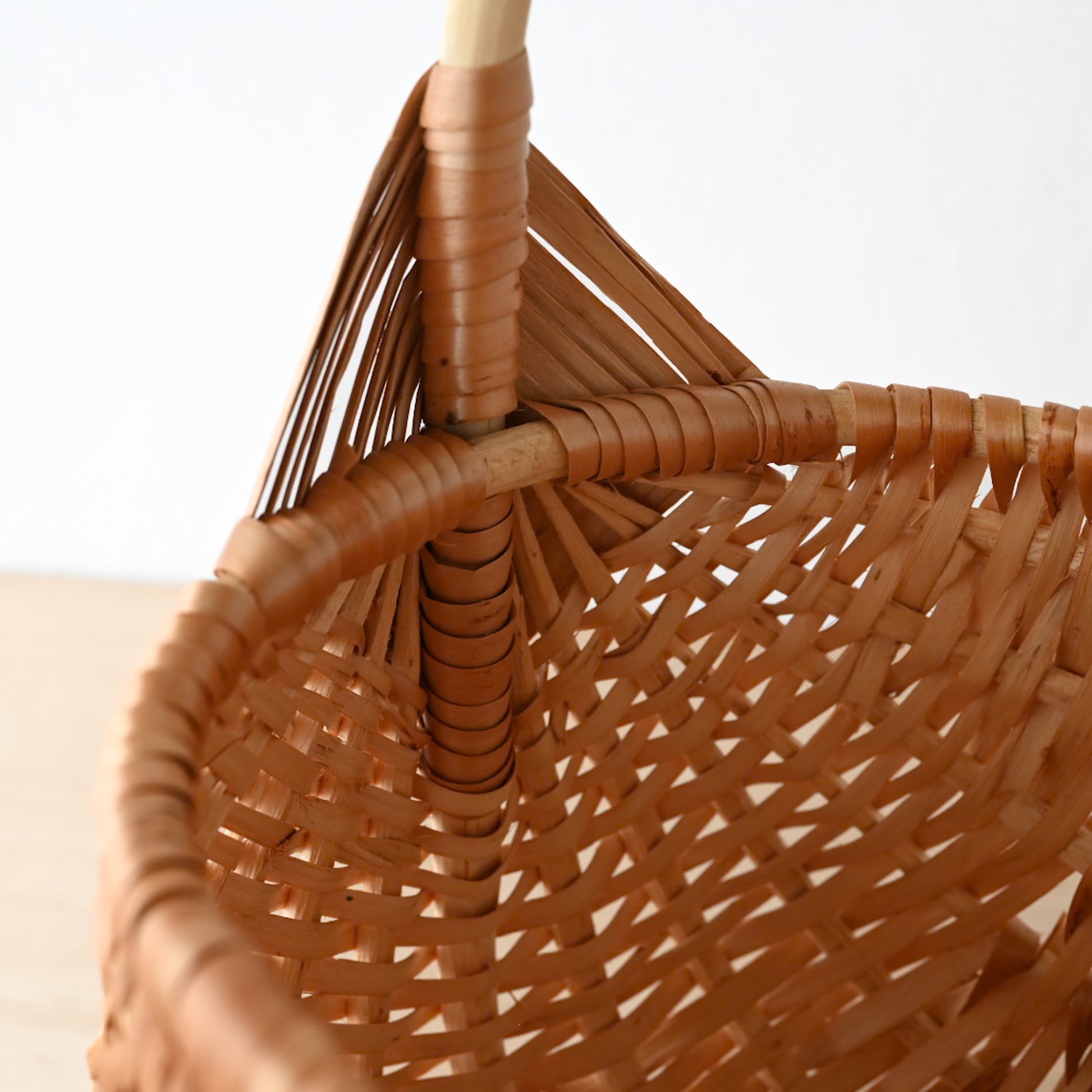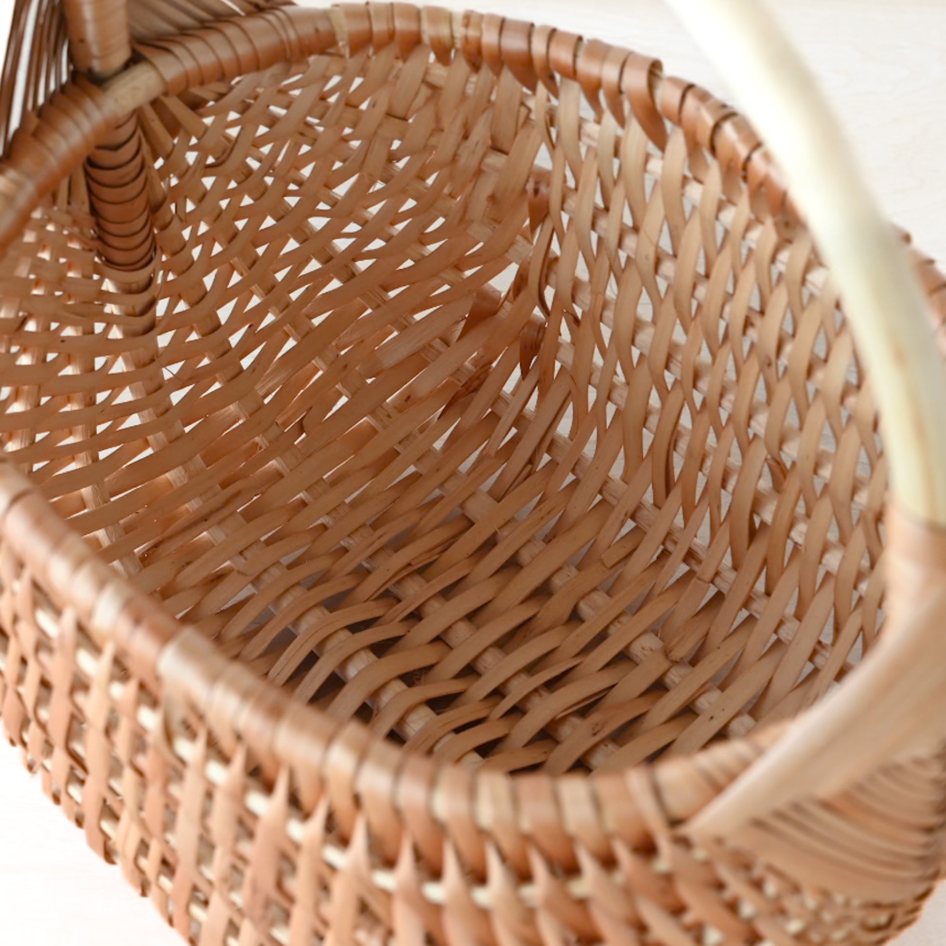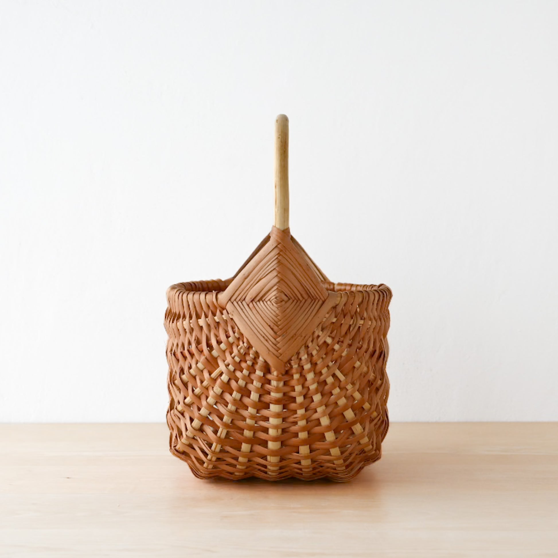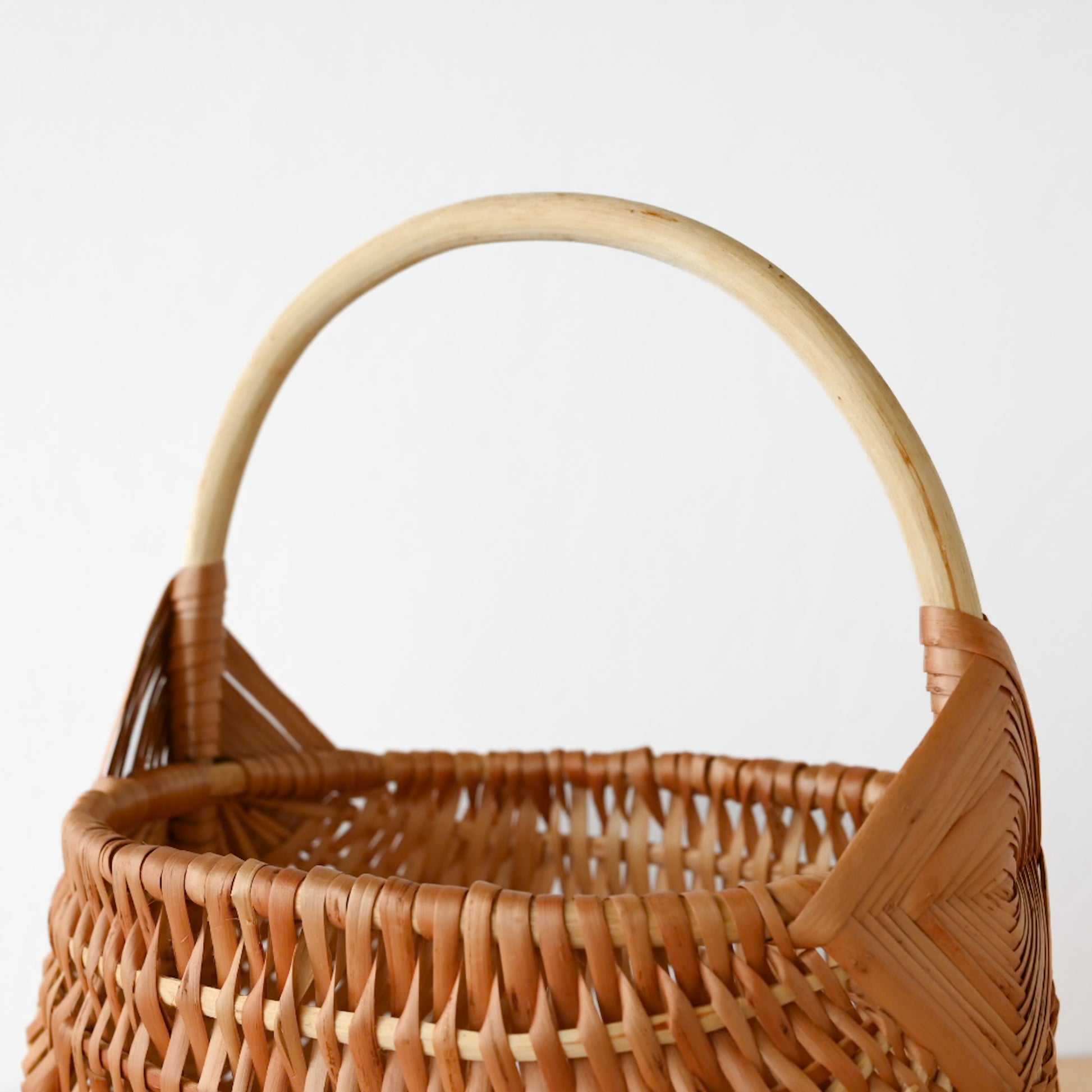 こちらのトールバスケットは、補強も兼ねた菱形の飾り編みと、底面に向かって広がるフォルムが特徴的です。かごを知り尽くした職人さんだから出来る、素晴らしい手仕事です。持ち手には太めの枝がそのまま使われていて、手馴染みも良く、素材そのものを味わえる贅沢な仕様。お出かけに、収納やインテリアとして、そばにあると気分の上がるかごバッグです。