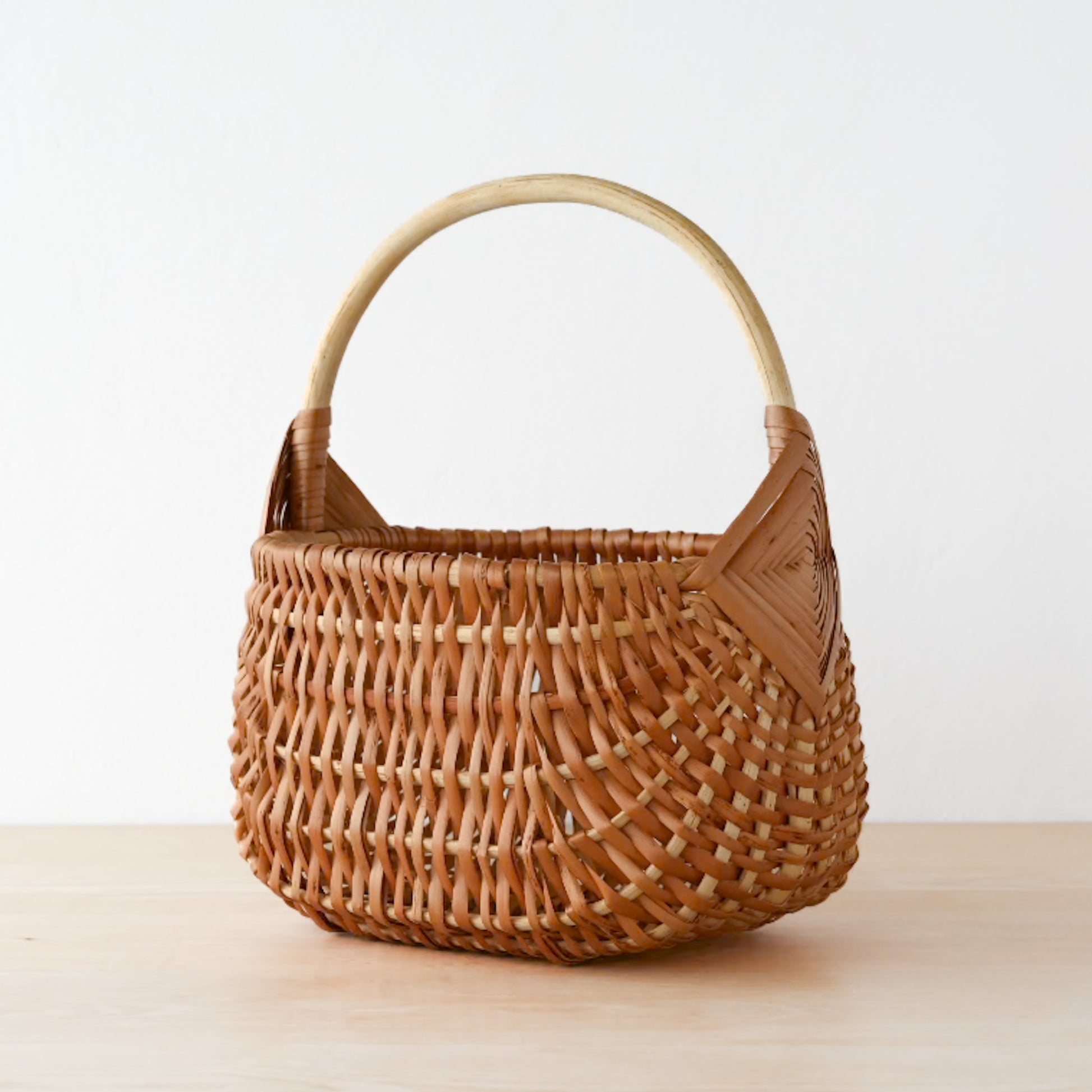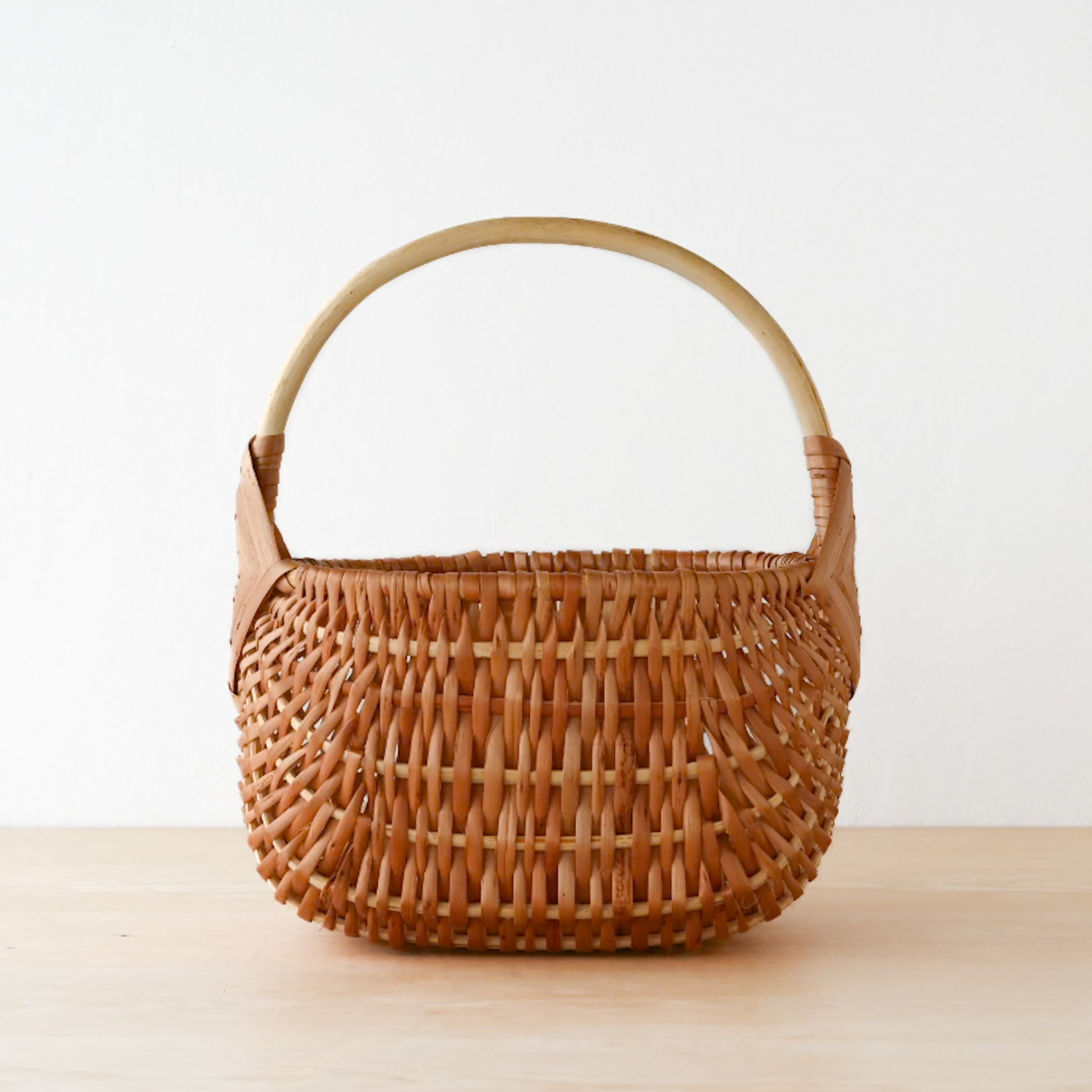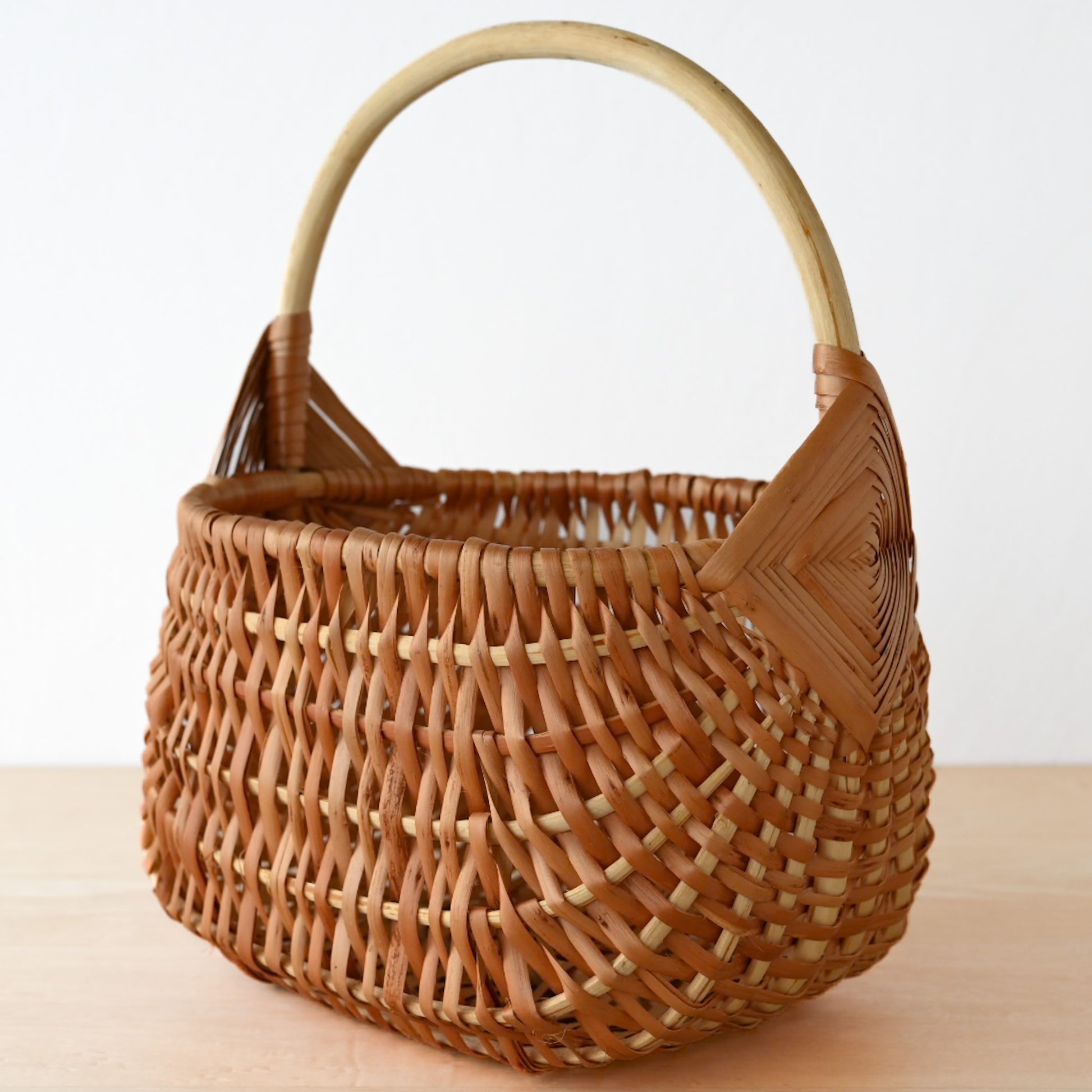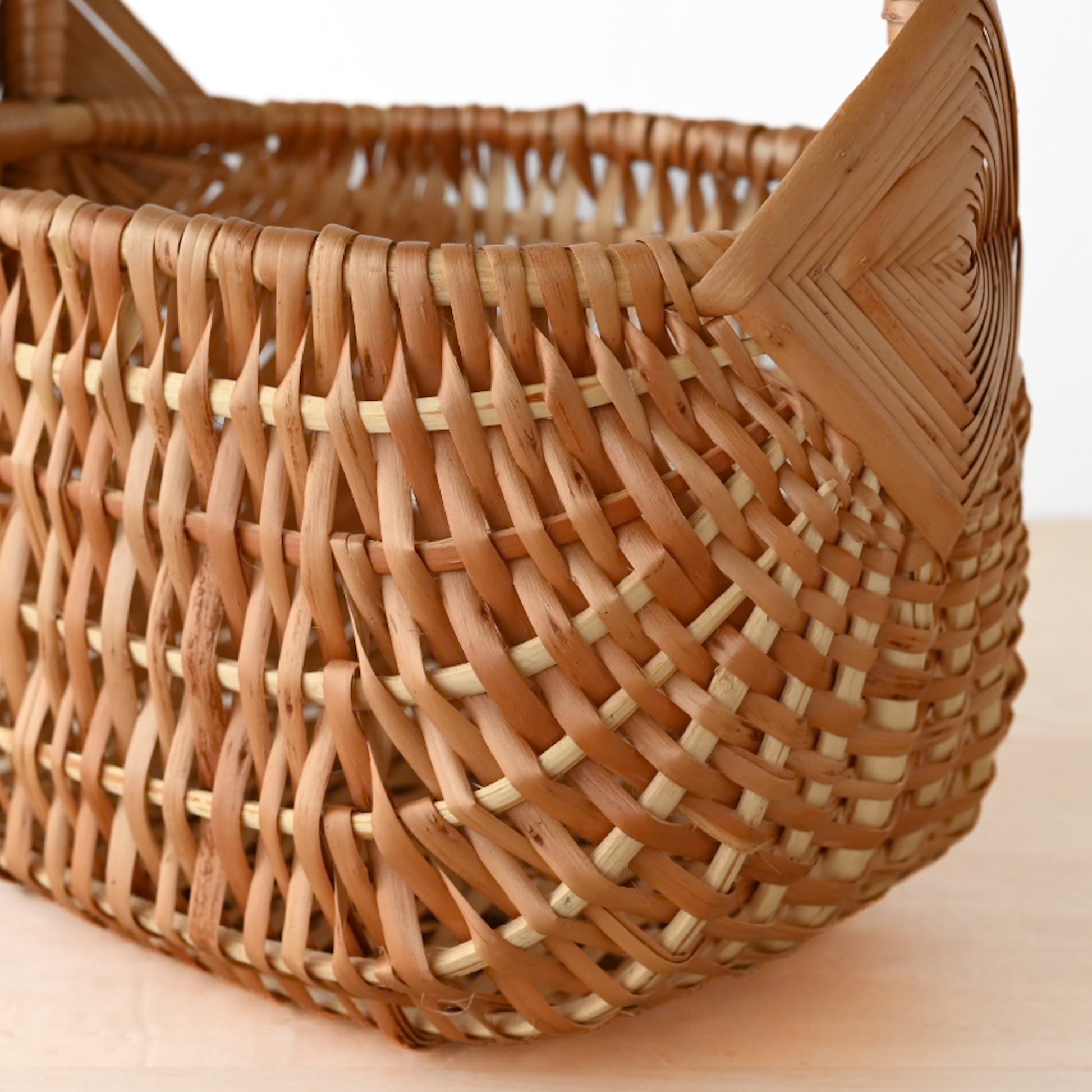 こちらのトールバスケットは、補強も兼ねた菱形の飾り編みと、底面に向かって広がるフォルムが特徴的です。かごを知り尽くした職人さんだから出来る、素晴らしい手仕事です。持ち手には太めの枝がそのまま使われていて、手馴染みも良く、素材そのものを味わえる贅沢な仕様。お出かけに、収納やインテリアとして、そばにあると気分の上がるかごバッグです。