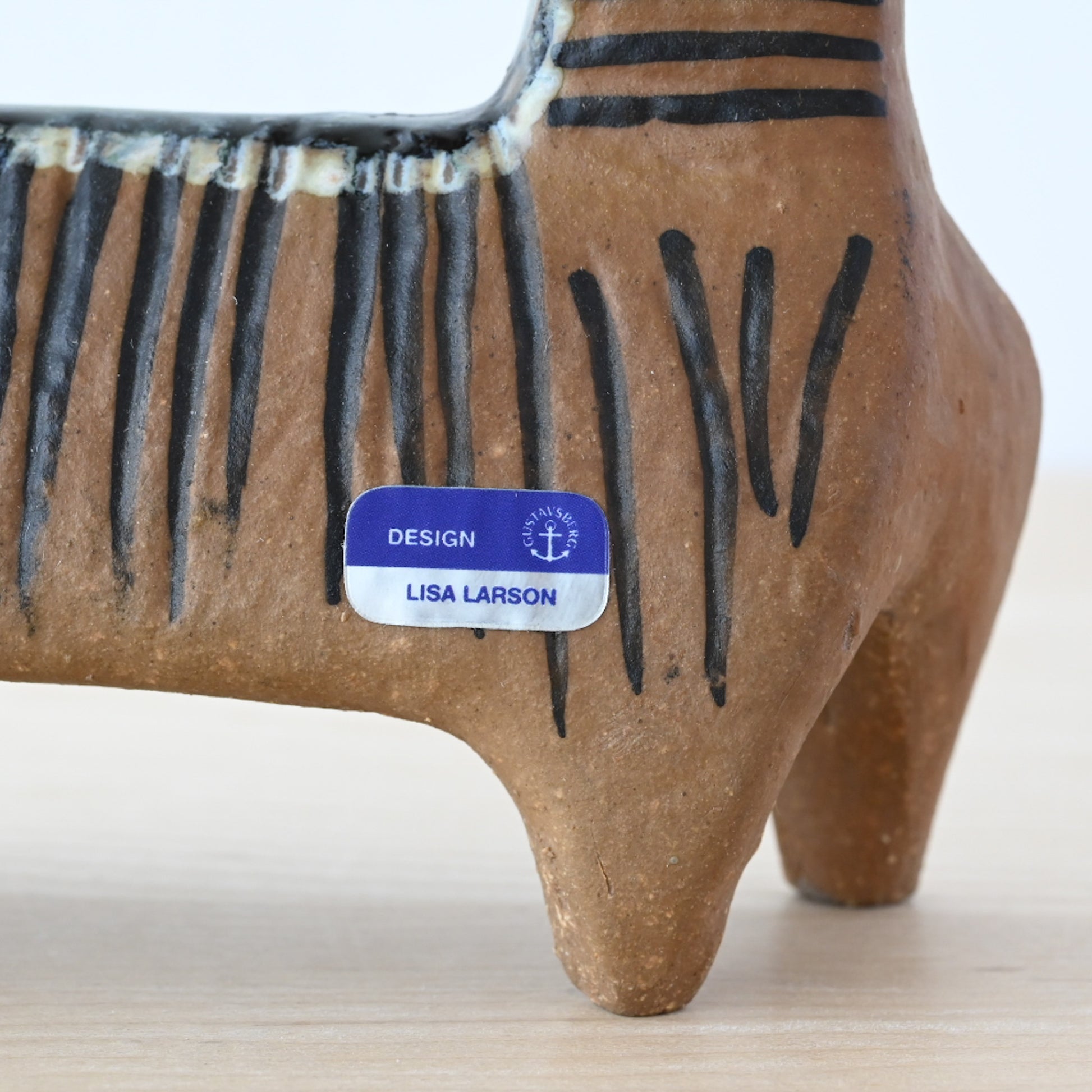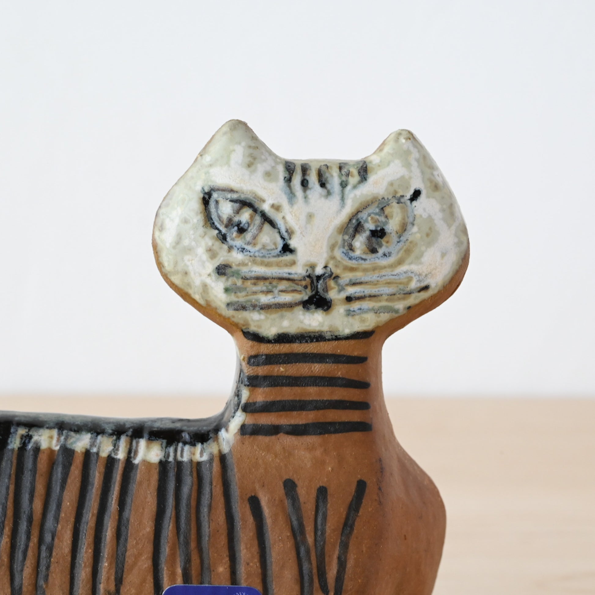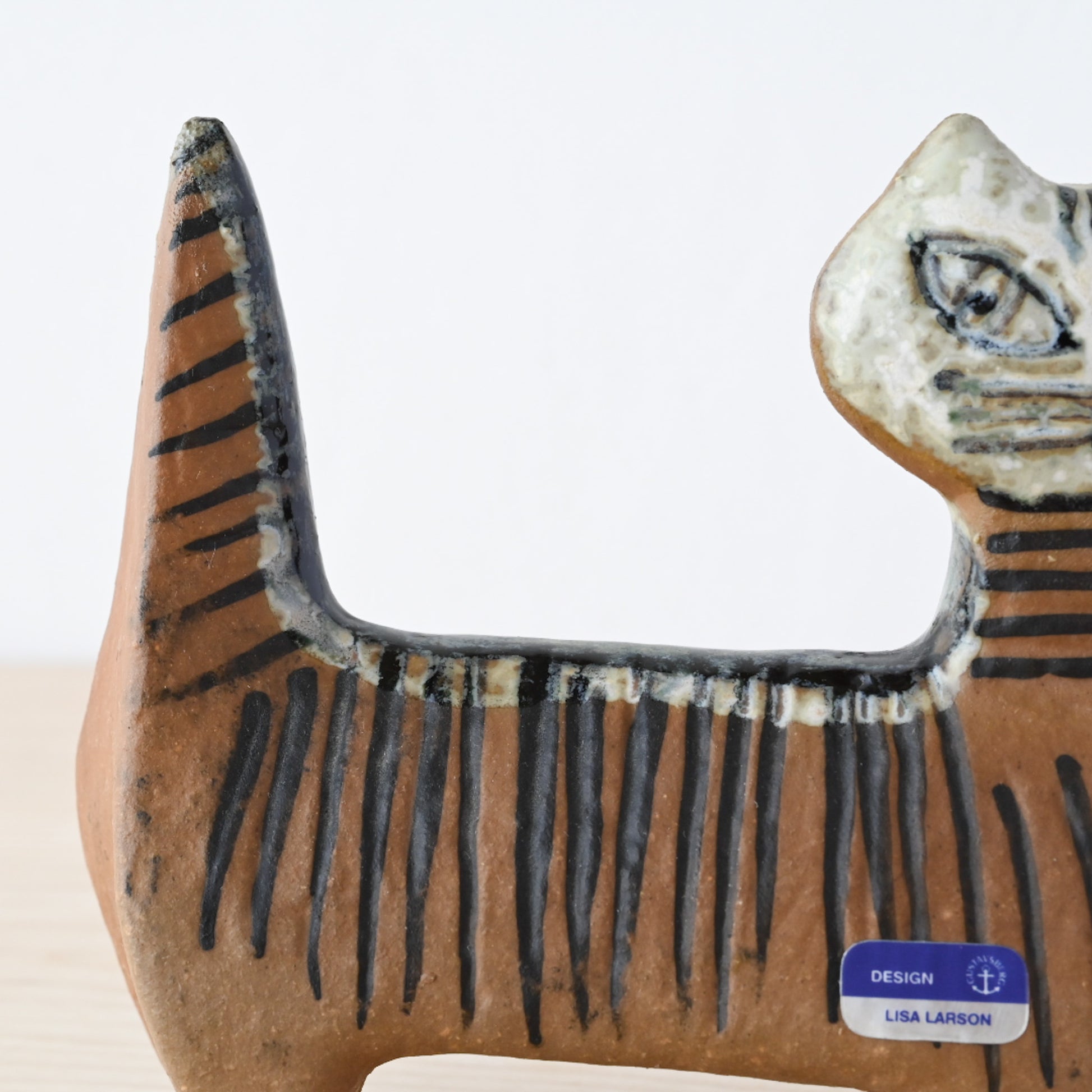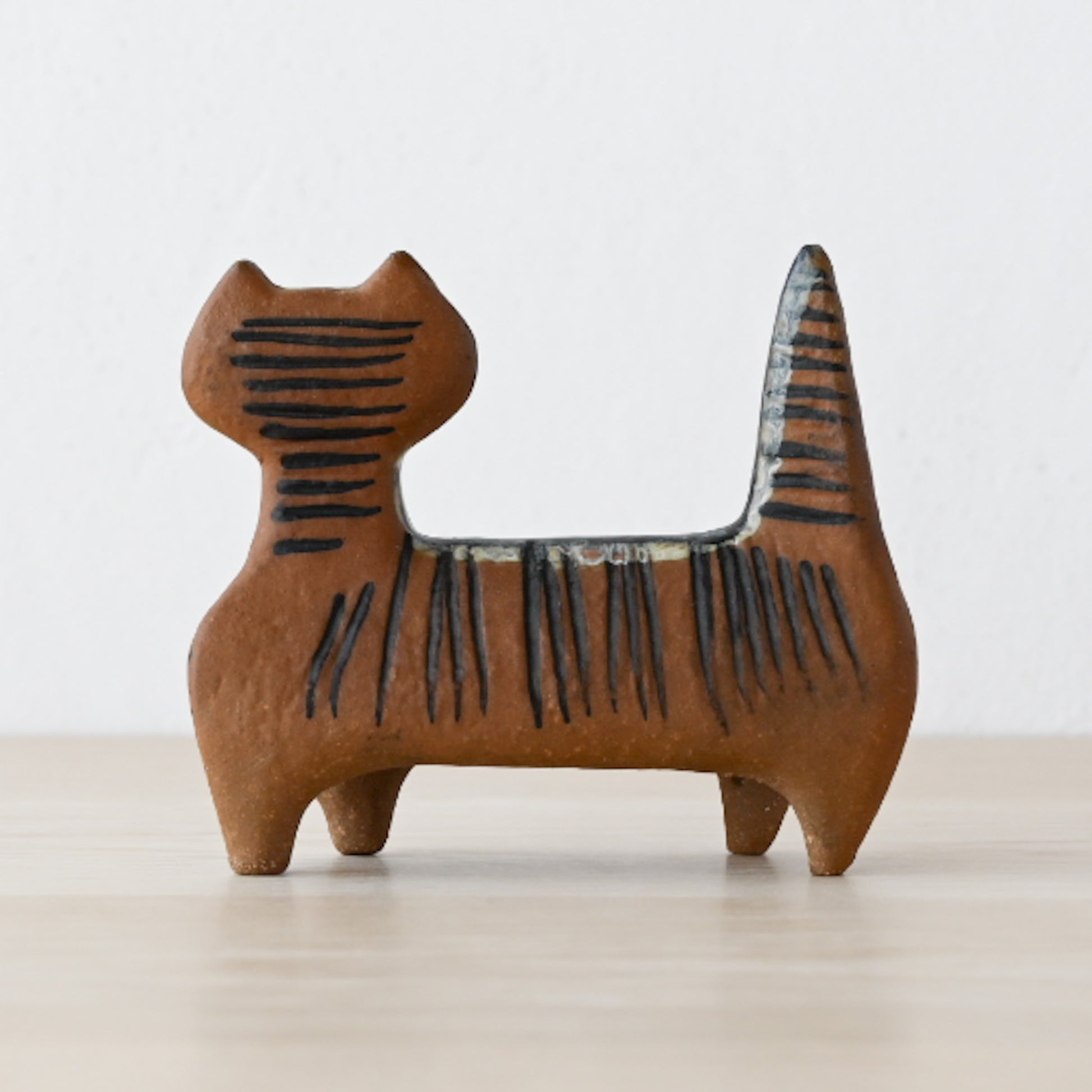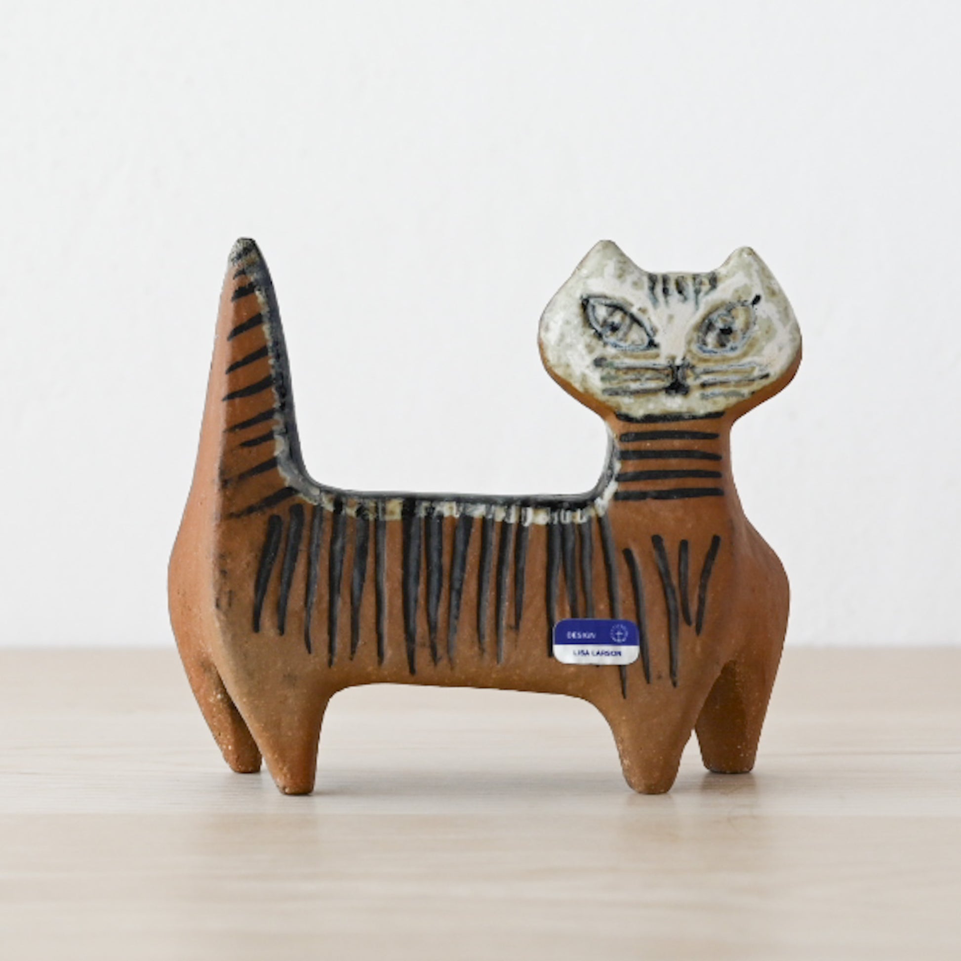 Lilla Zooシリーズには3種類のネコが存在しますが、こちらはそのうちのひとつの【4本脚で立つ猫】。スッと伸びた尻尾と、首から尾にかけて描かれた縞模様が特徴的で、凛とした表情に魅了されます。小さいながらも存在感のある佇まいに、つい足を止めて愛でたくなる作品です。