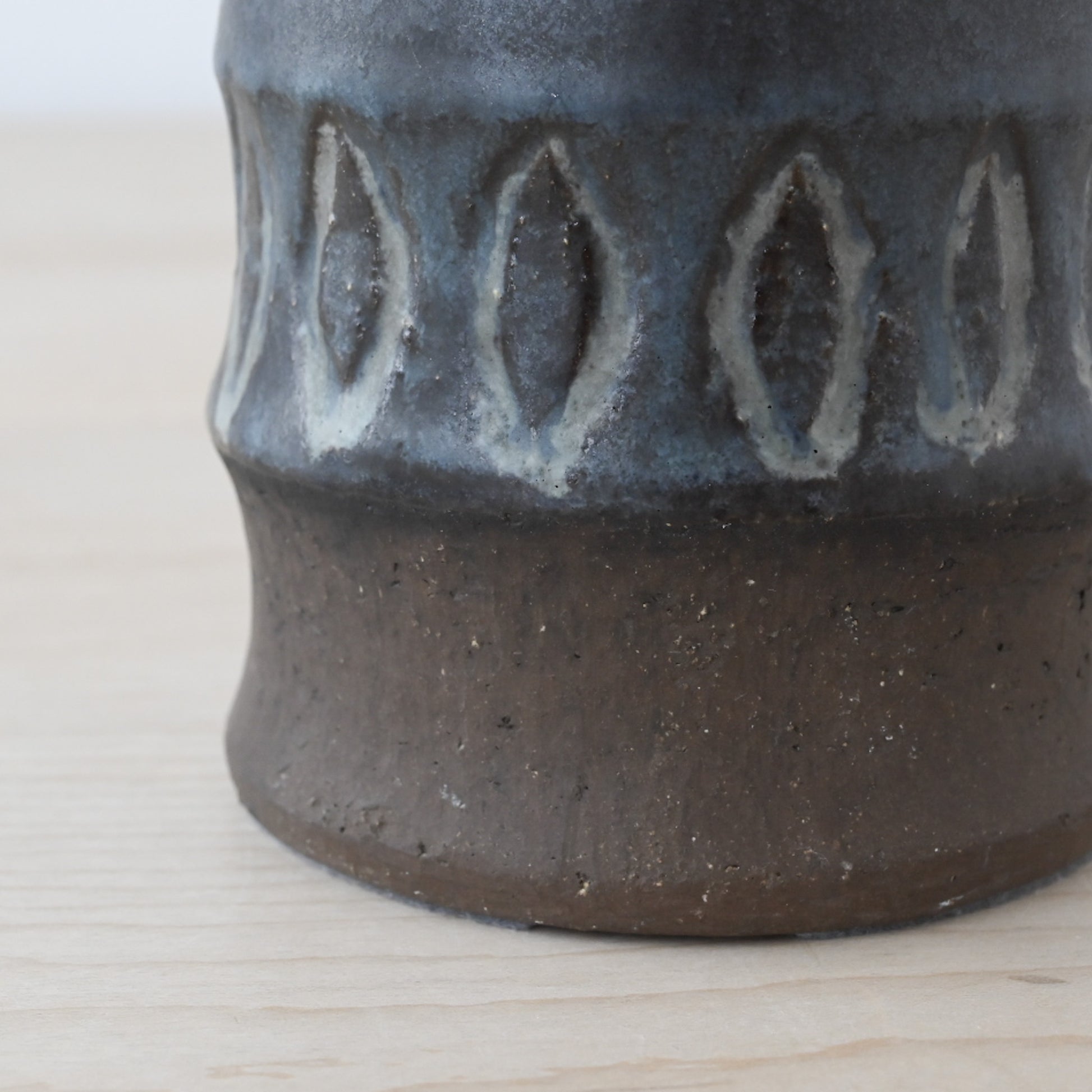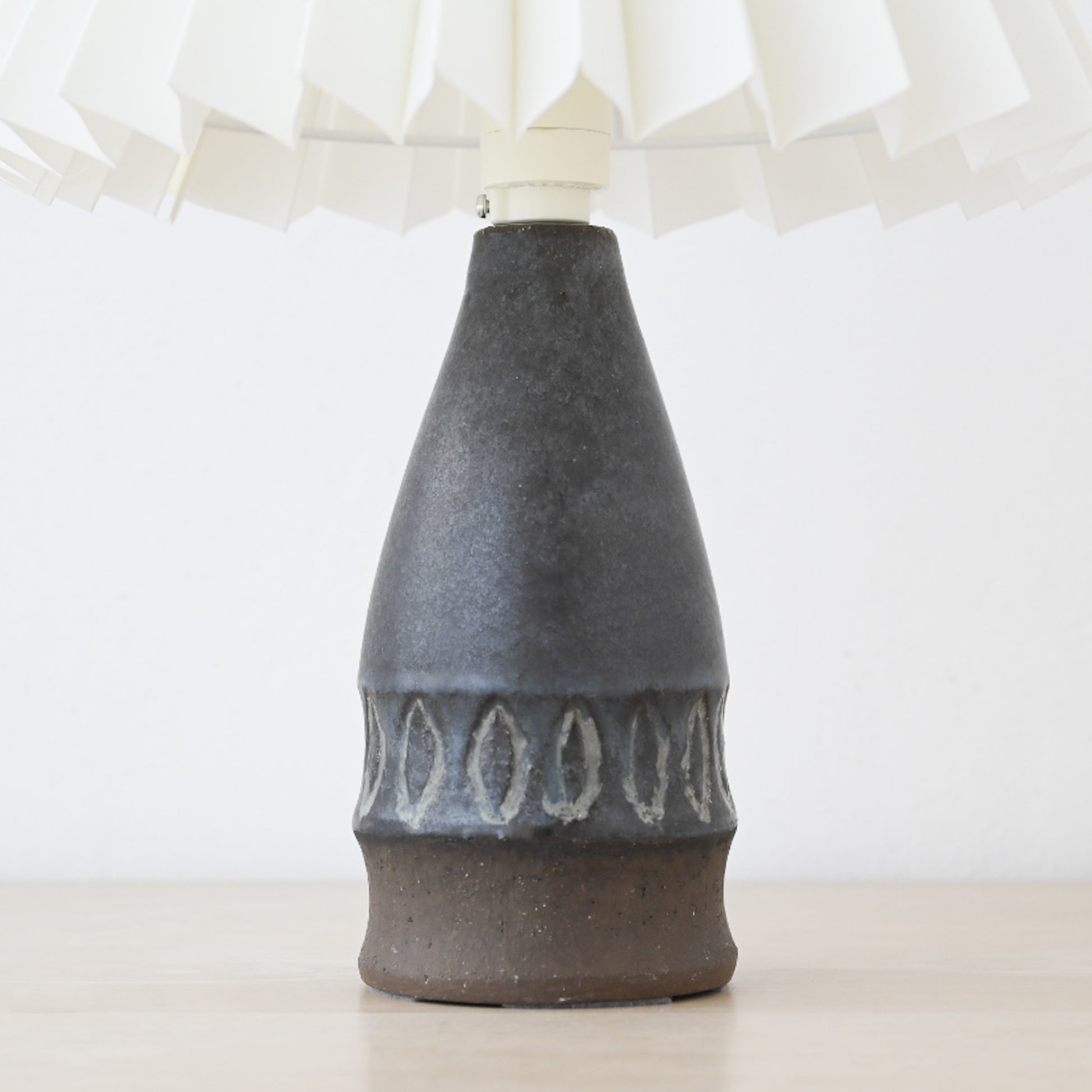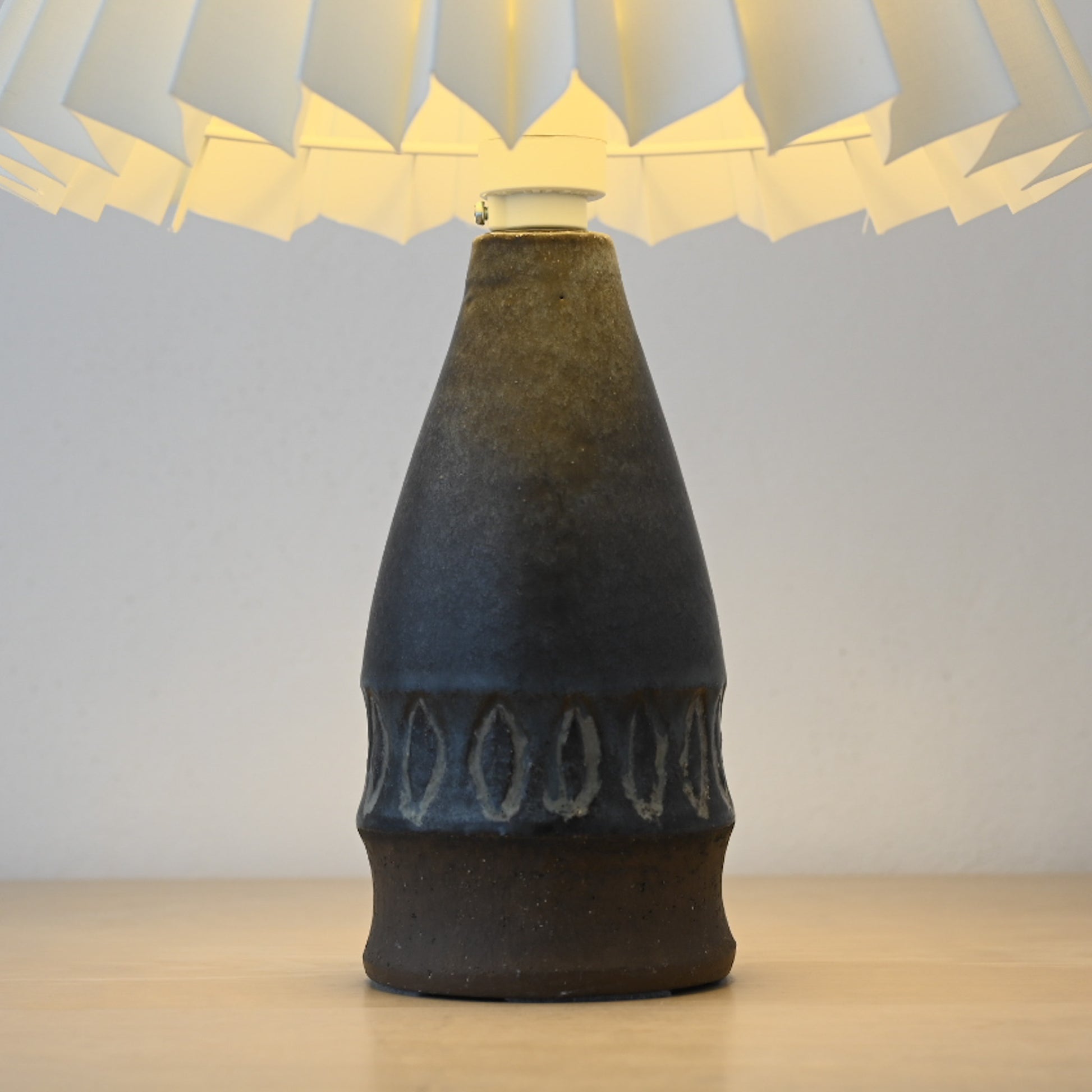 すっと立ち上がるフォルムに、深みのある釉薬。下部にはあえて素地を残し、土の質感がそのまま感じられる仕上がりです。一点ずつ手仕事で制作されているからこその個体差があり、味わいがあります。北欧ミッドセンチュリー期の陶芸と照明文化が結びついた、当時ならではの一品。オブジェとしても楽しめる、佇まいの美しいランプです。