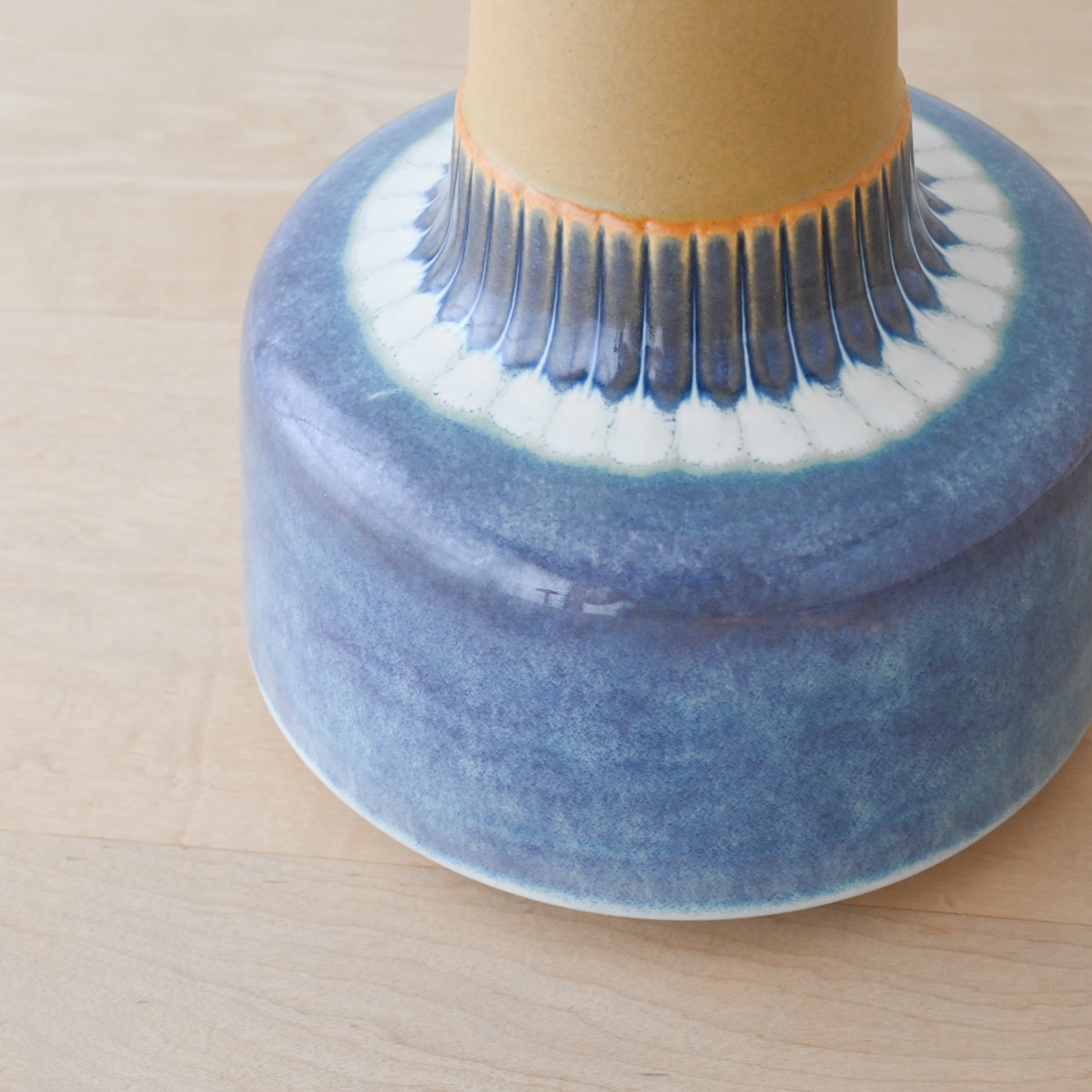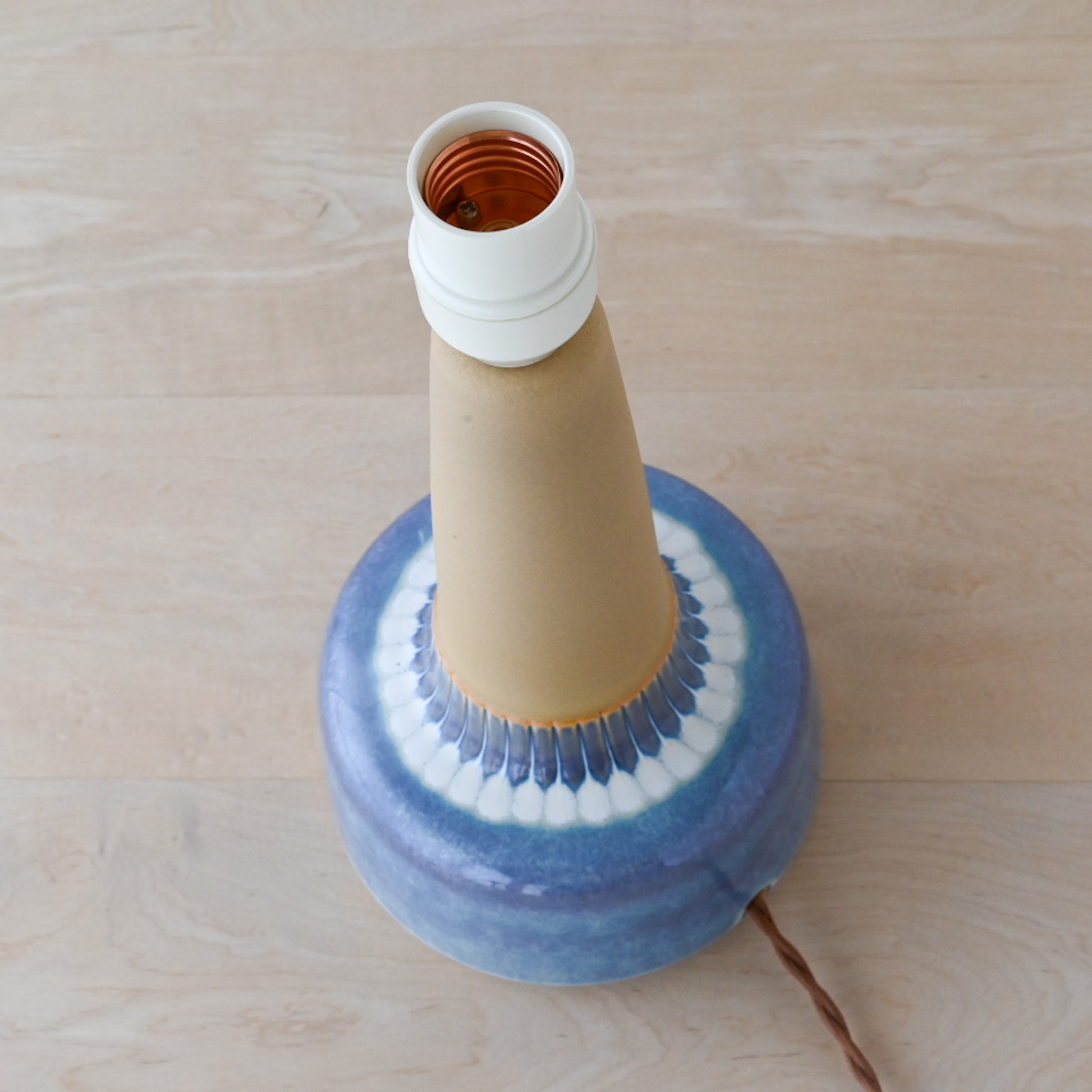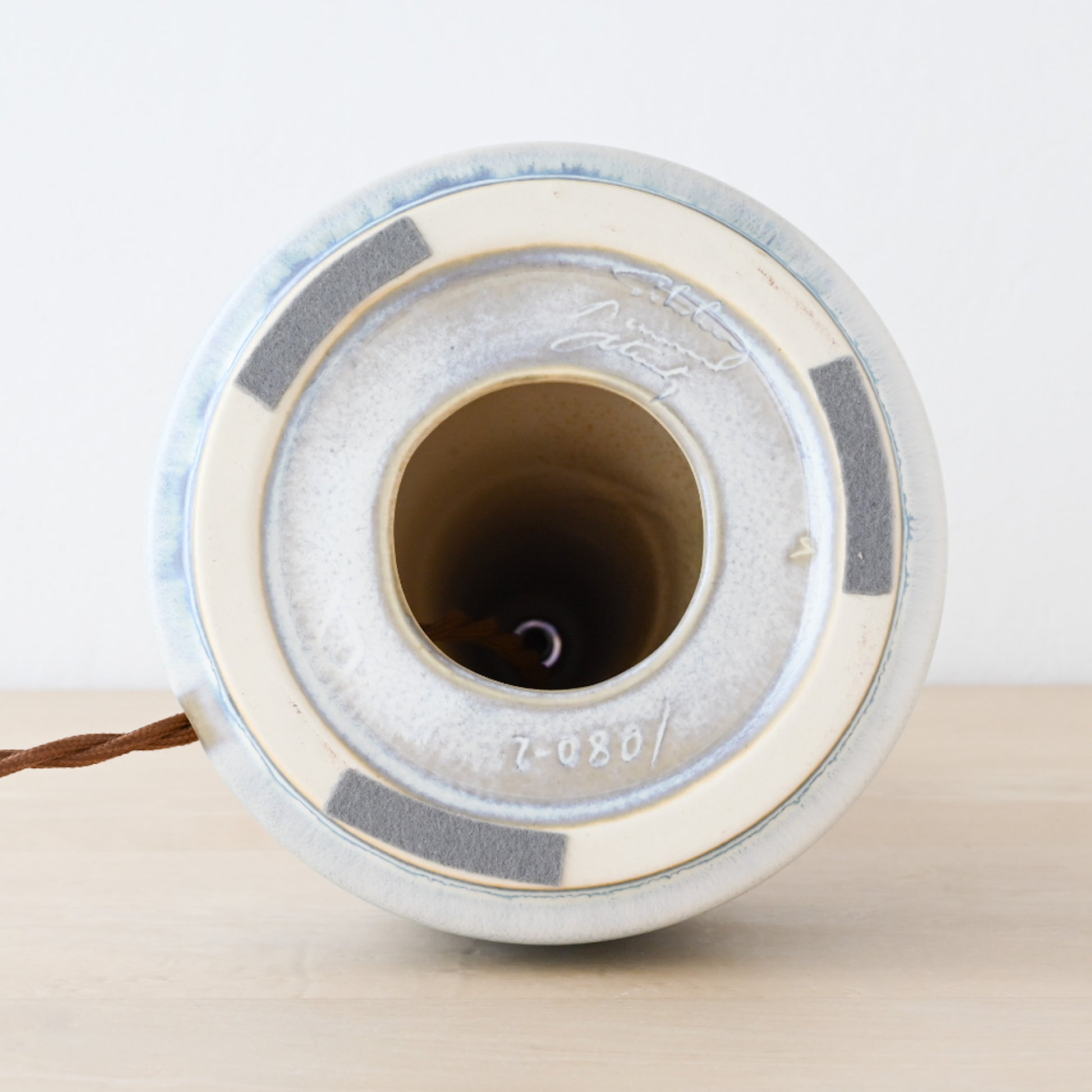 とても美しい釉薬を施した大きめのテーブルランプ。下部には青と白のハイライトが入った美しいまだら模様の薄紫釉が施されています。窯内の環境や釉薬のかかり方によって仕上がりが変わる為、一つとして同じ作品はありません。優しい色合いでパッと目を惹く優雅なフォルムのテーブルランプは、お部屋の主役になること間違いなしです。ベースには製造元の詳細、デザイナーのマーク、モデル番号が刻印されています。