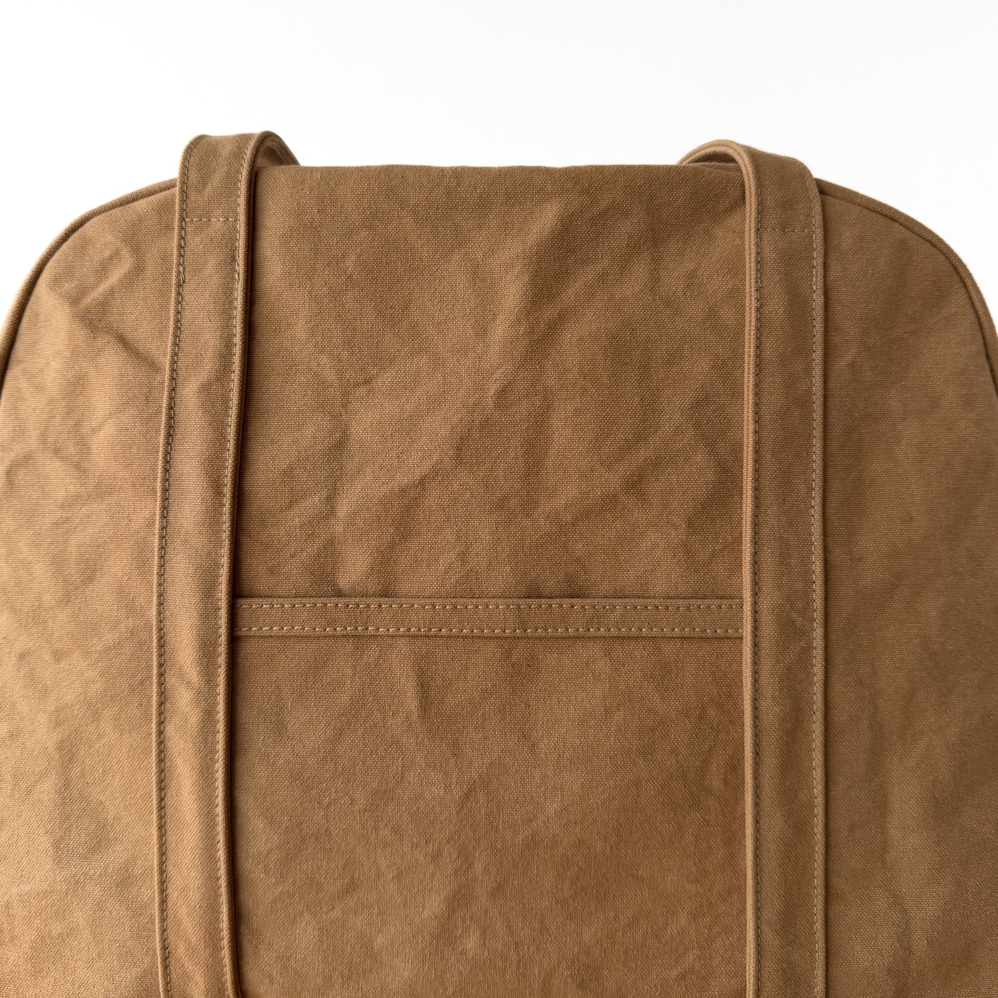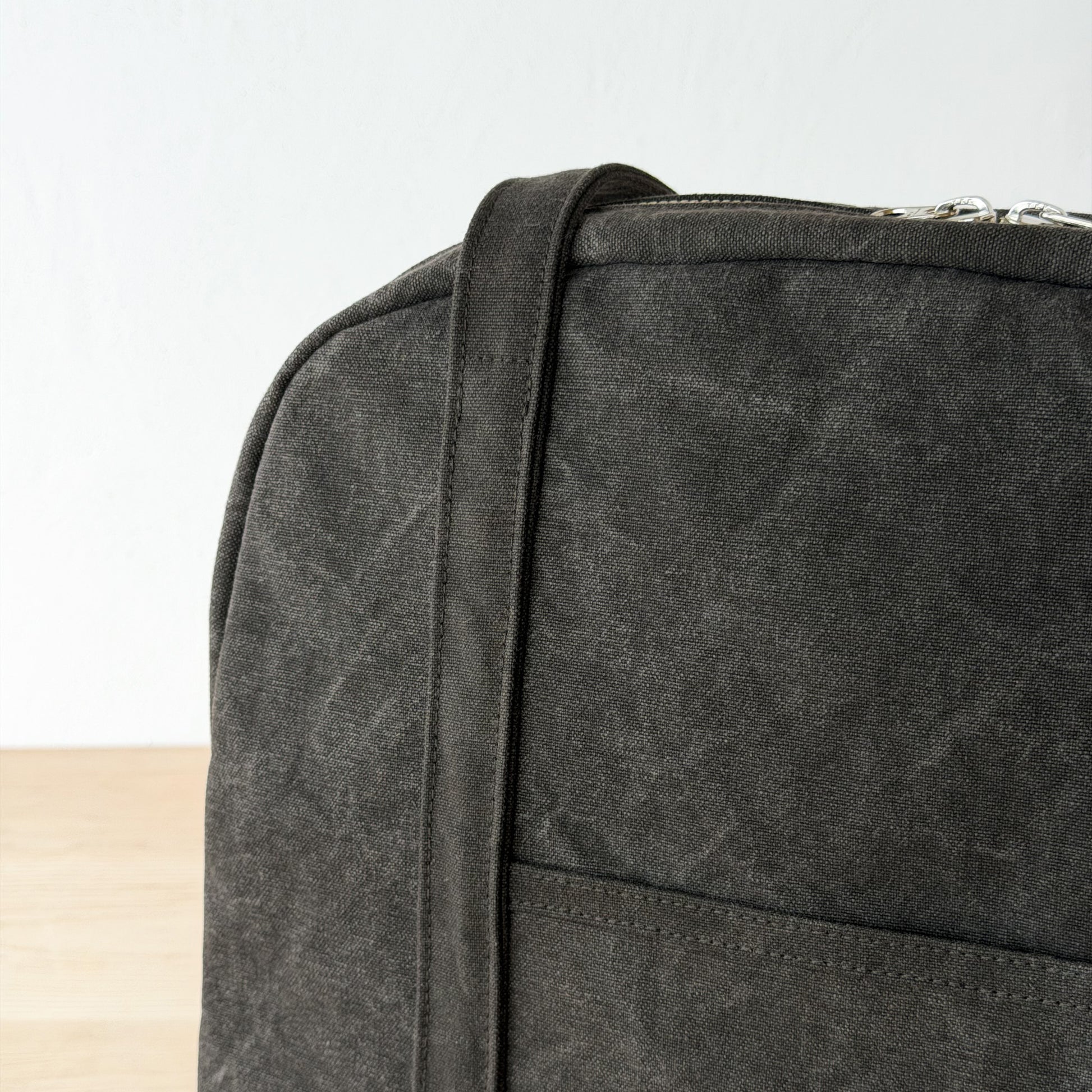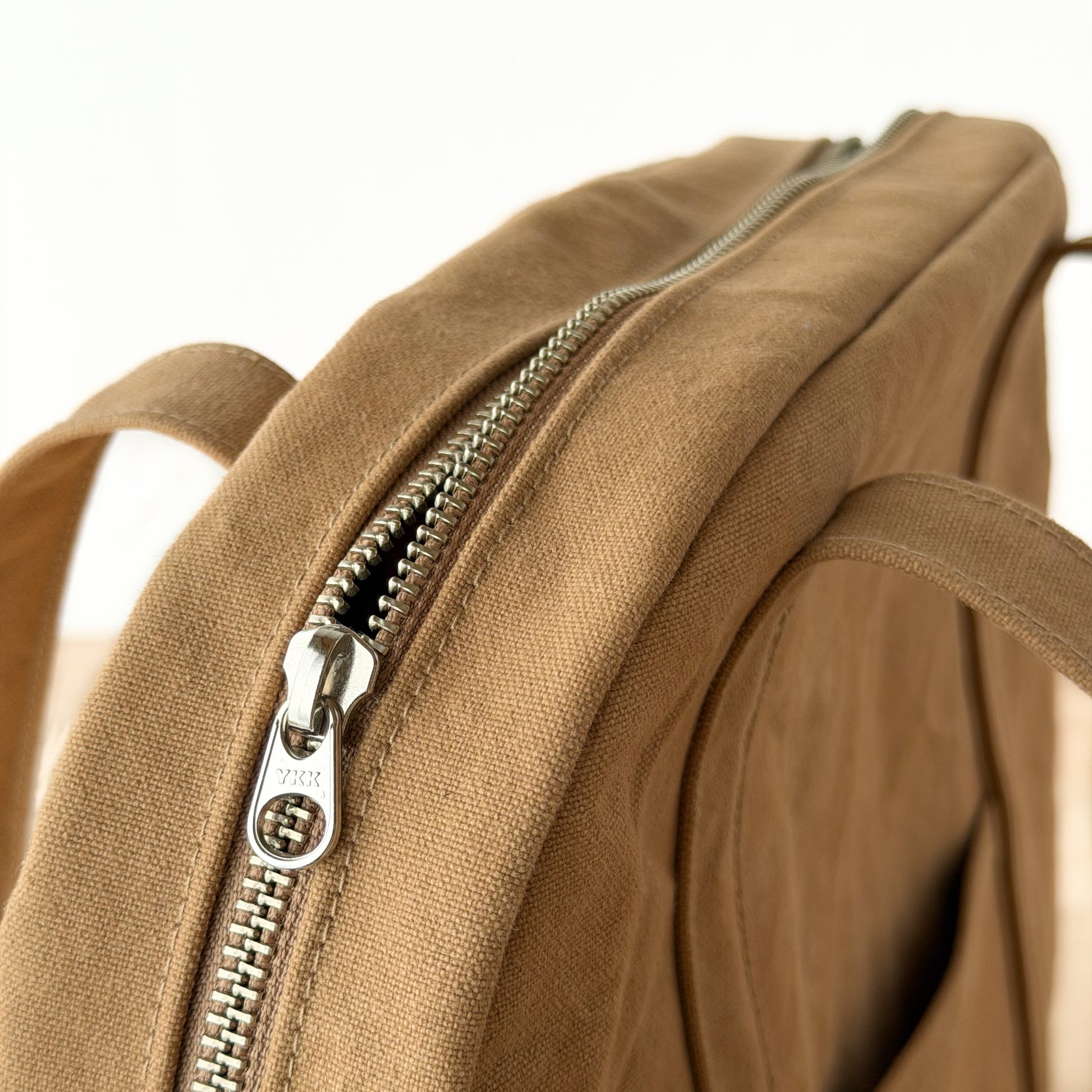 自然由来の染料で丁寧に染め上げた9号帆布を使用しており、使うほどに柔らかさと風合いが増します。開口部はダブルスライダー仕様のファスナーで大きく開き、荷物の出し入れもスムーズです。
