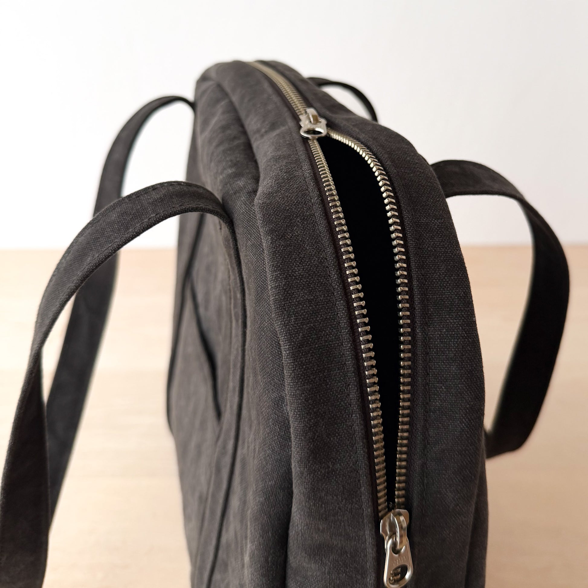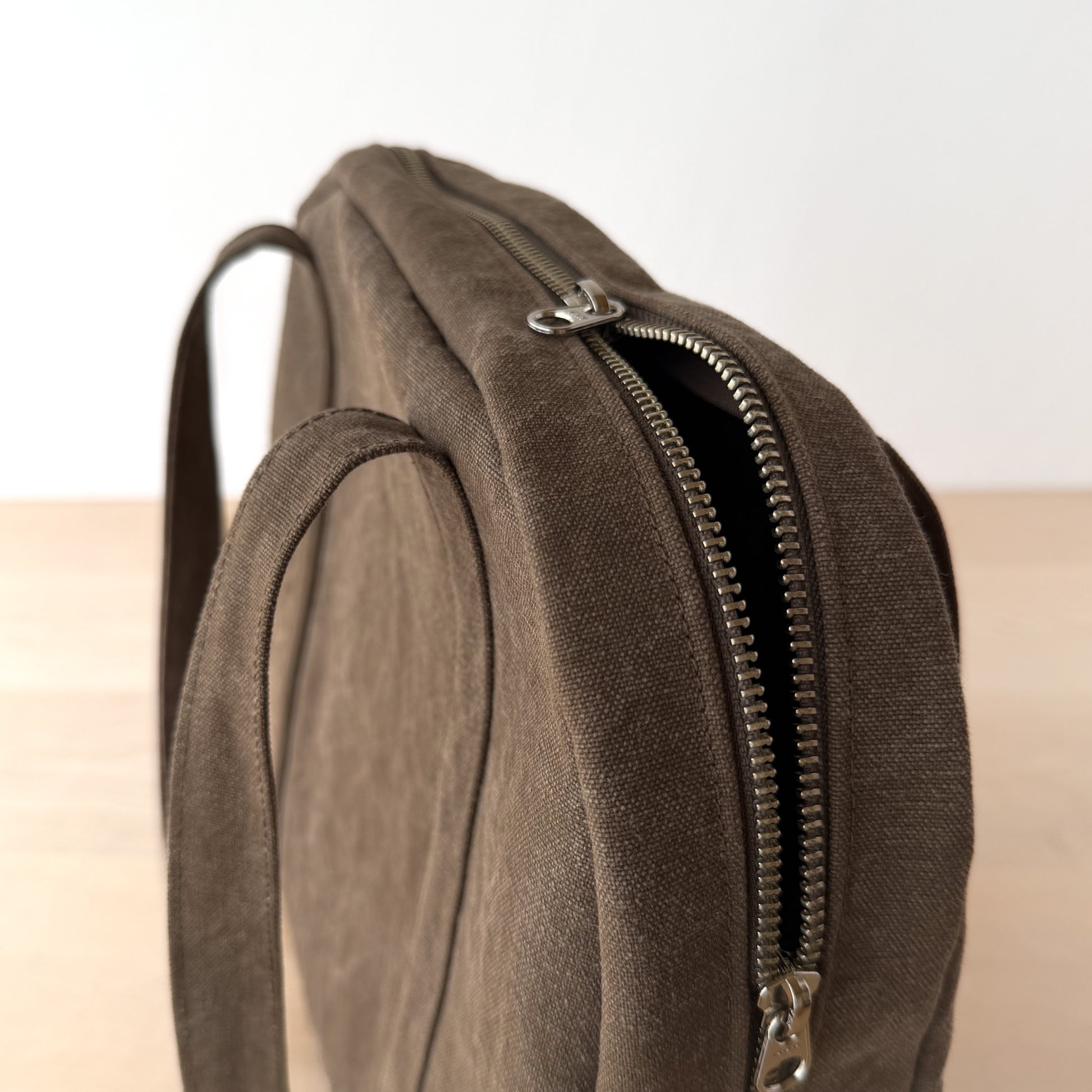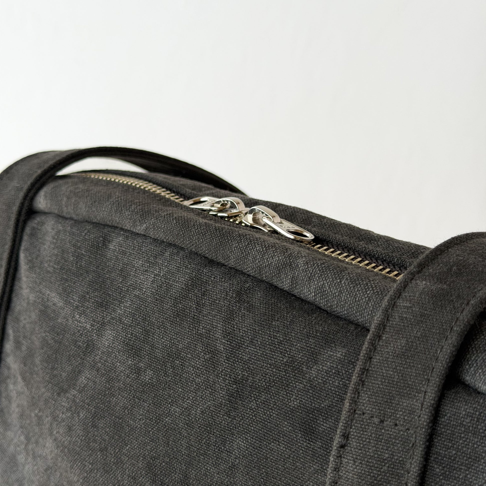 自然由来の染料で丁寧に染め上げた9号帆布を使用しており、使うほどに柔らかさと風合いが増します。開口部はダブルスライダー仕様のファスナーで大きく開き、荷物の出し入れもスムーズです。